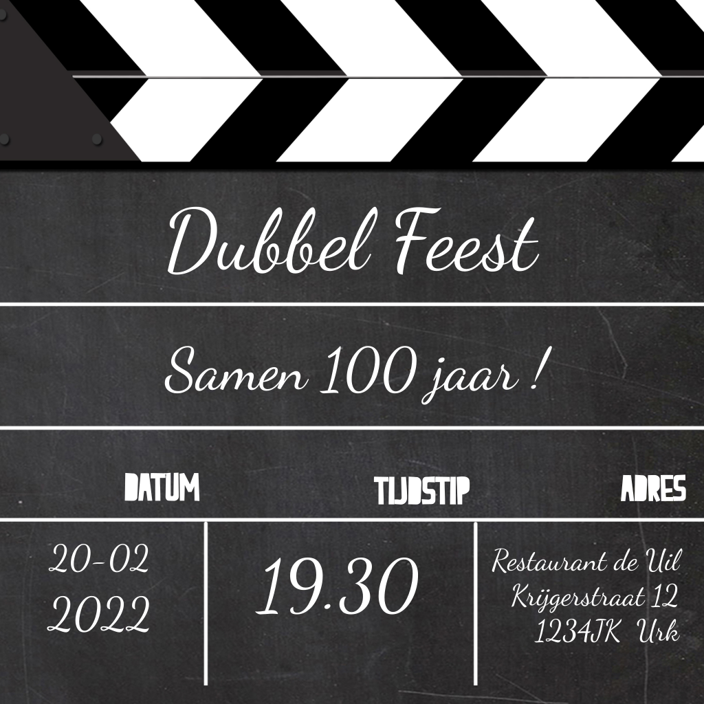 Uitnodiging samen 100 jaar met film klapper scene bord in zwart wit met aanpasbare teksten en vierkant. (3003)