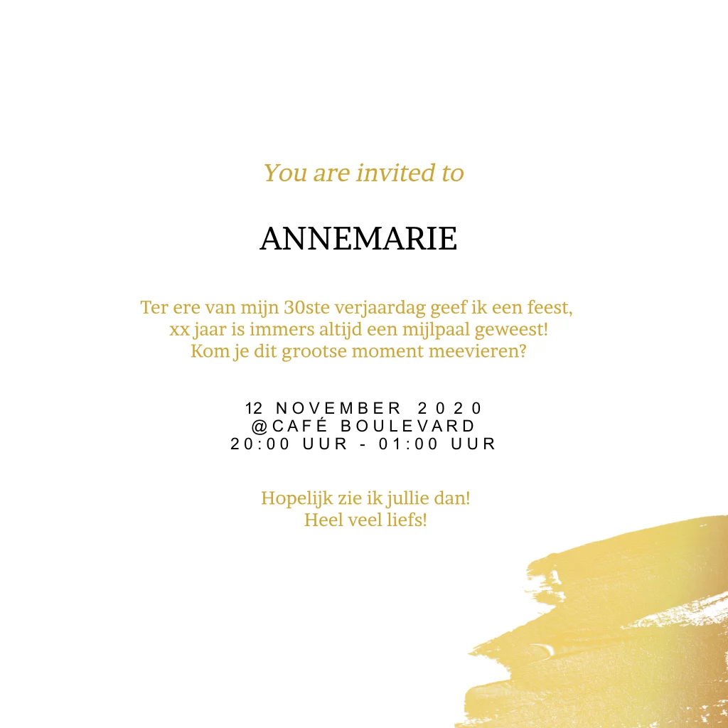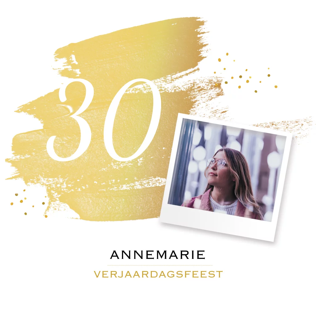 Uitnodiging 30e verjaardag goud tinten confetti streep en foto