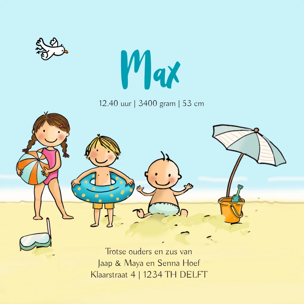 3e kindje geboortekaartje zomer zee en strand met 2 zussen