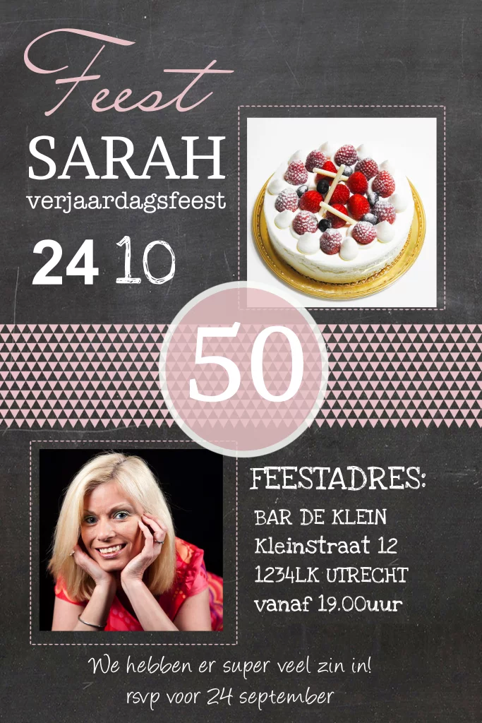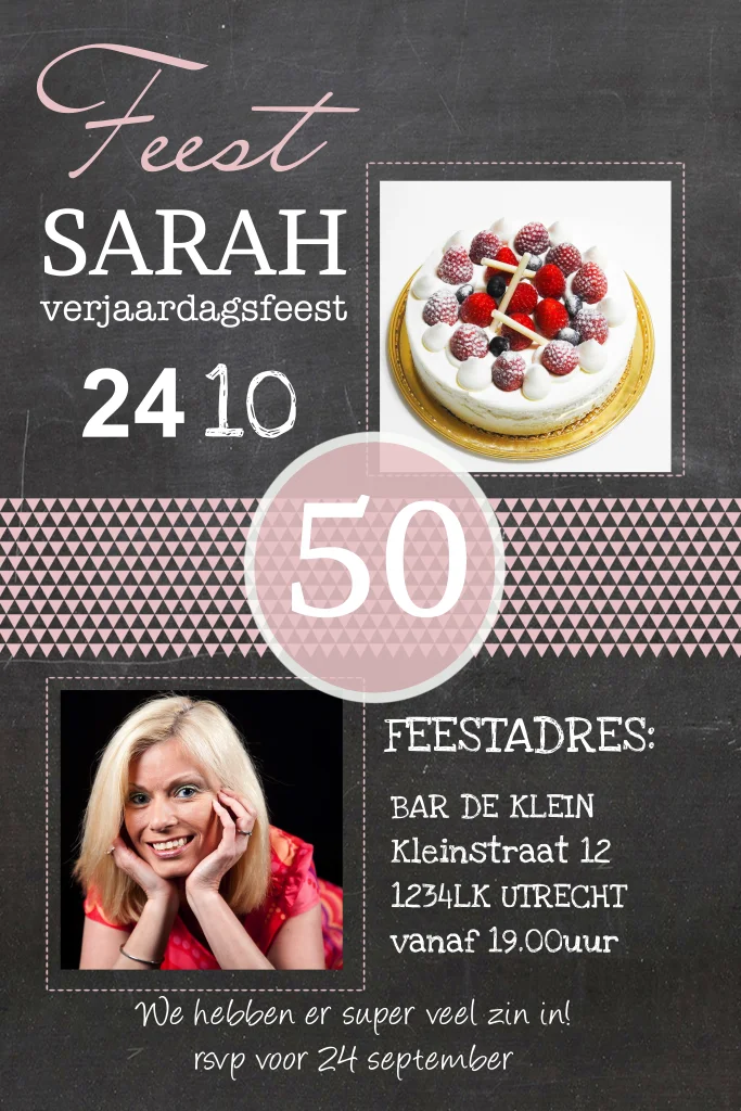 Uitnodiging 50ste verjaardag Sarah met krijtbord strak zalm