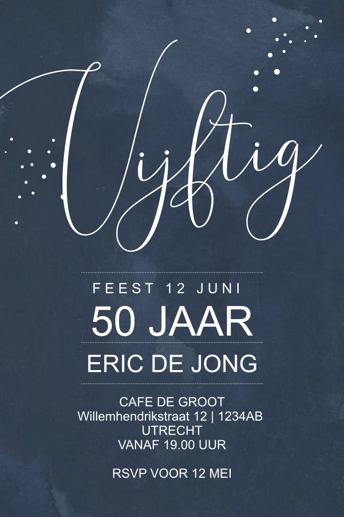 Uitnodiging voor een 50e verjaardag met blauwe achtergrond en holografische foliedruk. (24111)