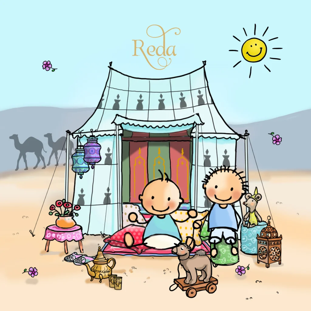 Islamitisch thema geboortekaartje voor een 2e kindje met Berber tent en accessoires. Arabische, islamitische stijl. (3317)