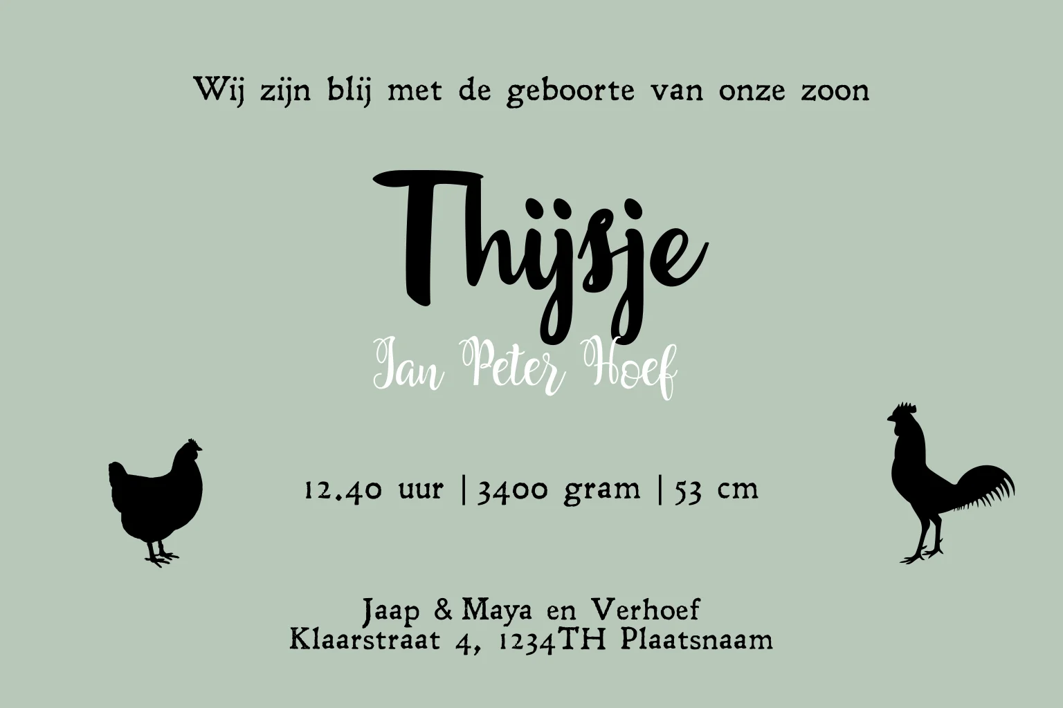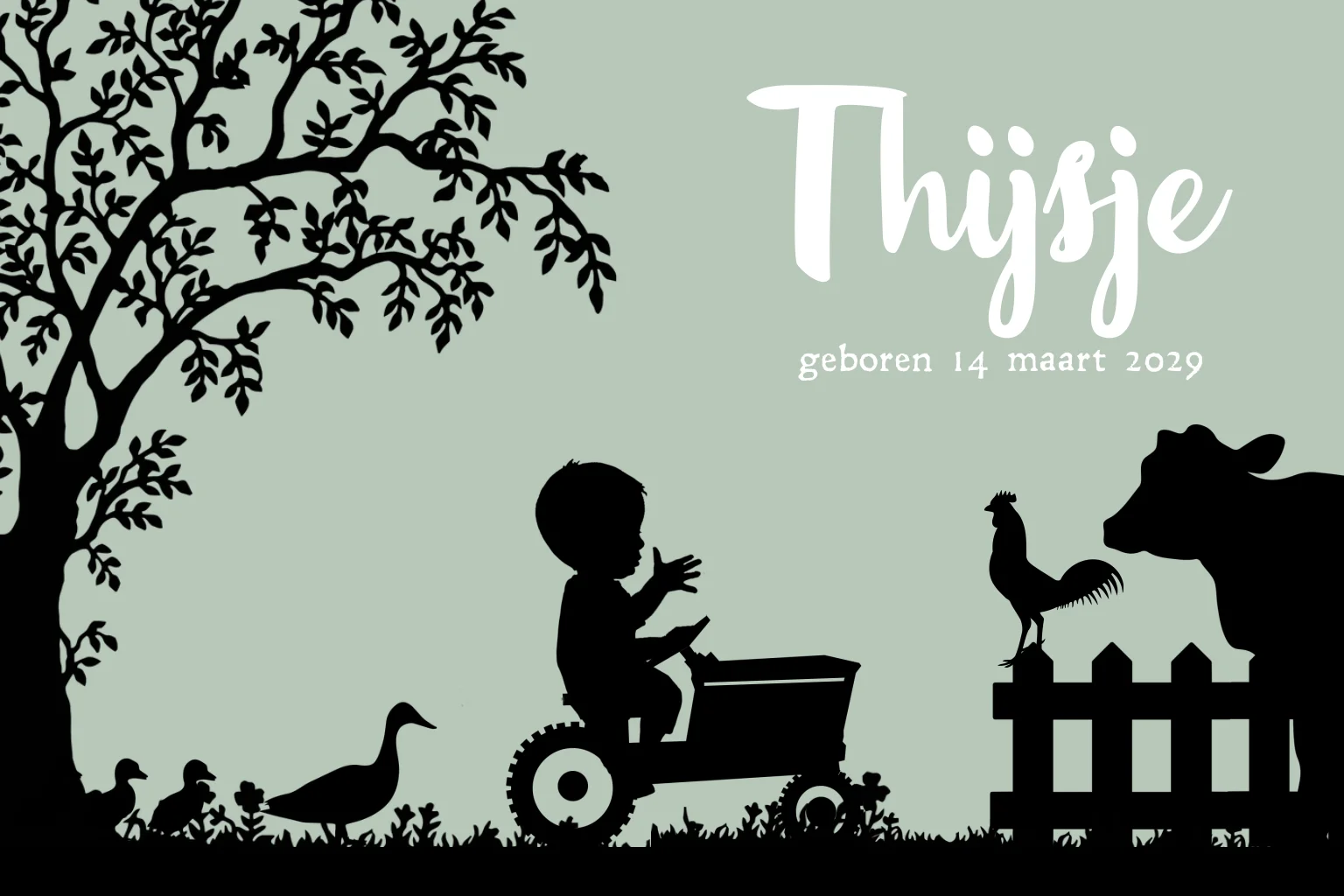 Boerderij-thema geboortekaartje jongen op tractor met een boom, geit, haan, kip, koe en schaap. (7309) Het kaartje kan helemaal aangepast worden qua kleur en dieren.