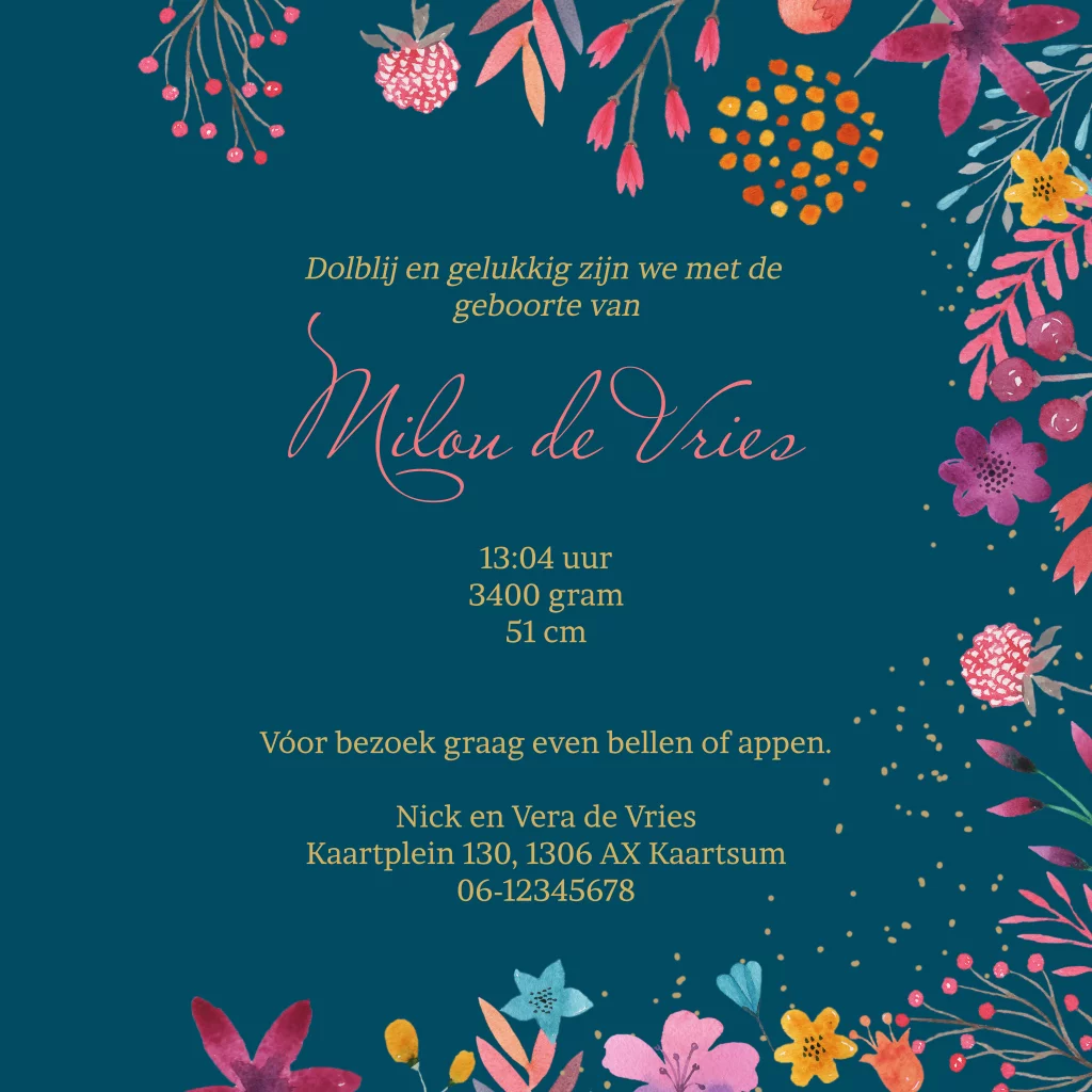 Bohemian Floral stijl geboortekaartje met waterverf geschilderde bloemen. De achtergrond kleur is zelf naar wens aan te passen. (7556)