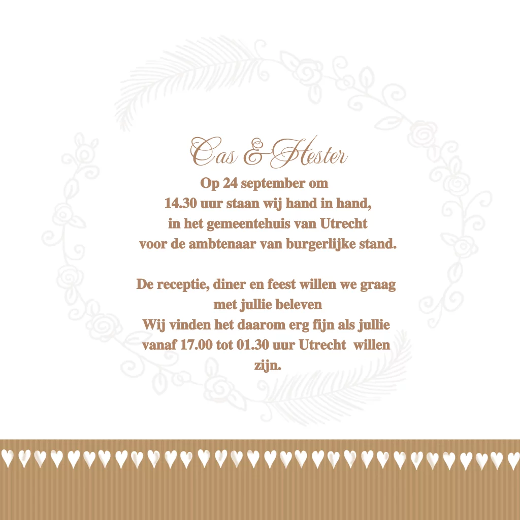 Bruine kartonnen trouwkaart met witte veertjes. (1606)