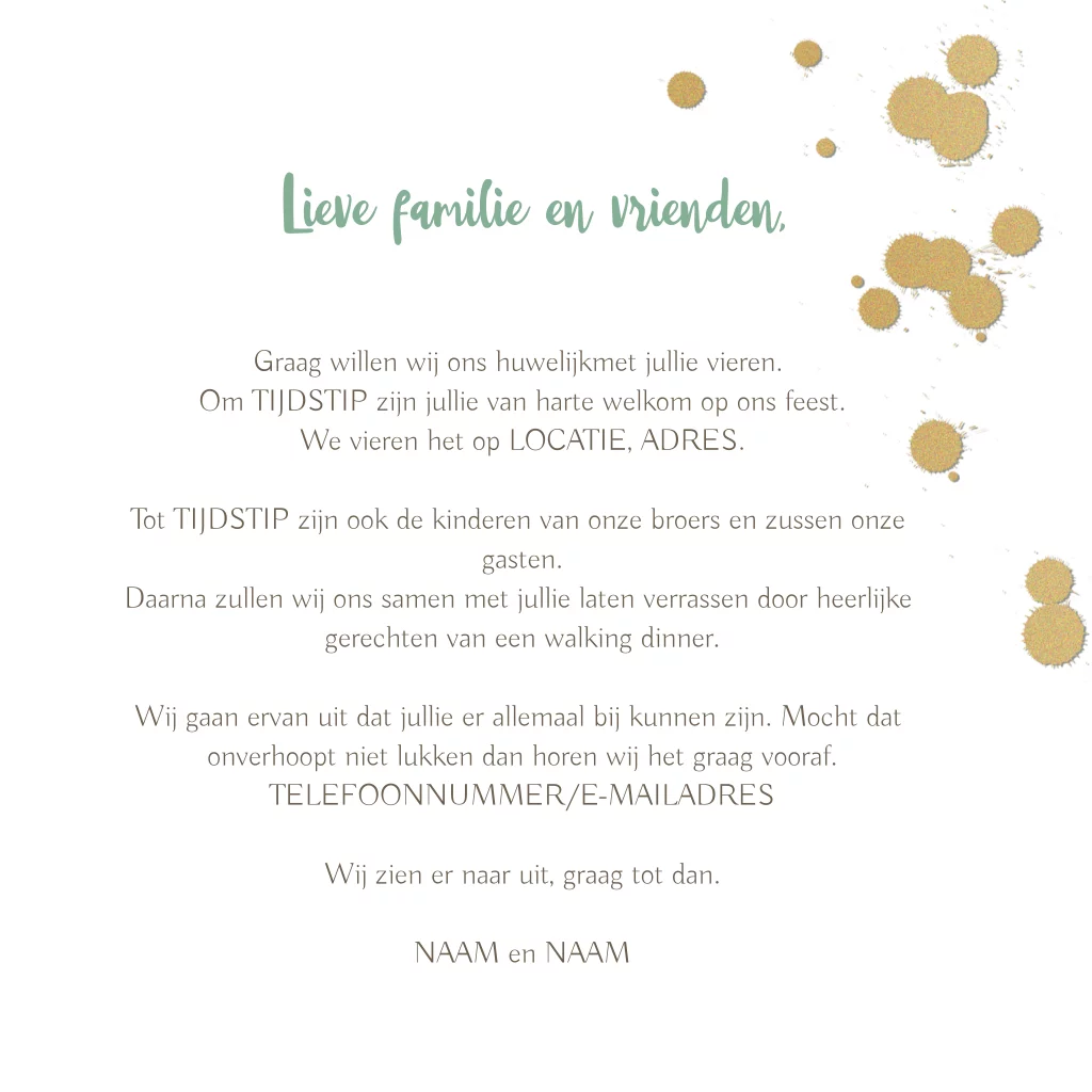 Stijlvolle trouwkaart om je gasten uit te nodigen voor jullie huwelijk. Achtergrond met groene waterverf, foto en met confetti. (7358)