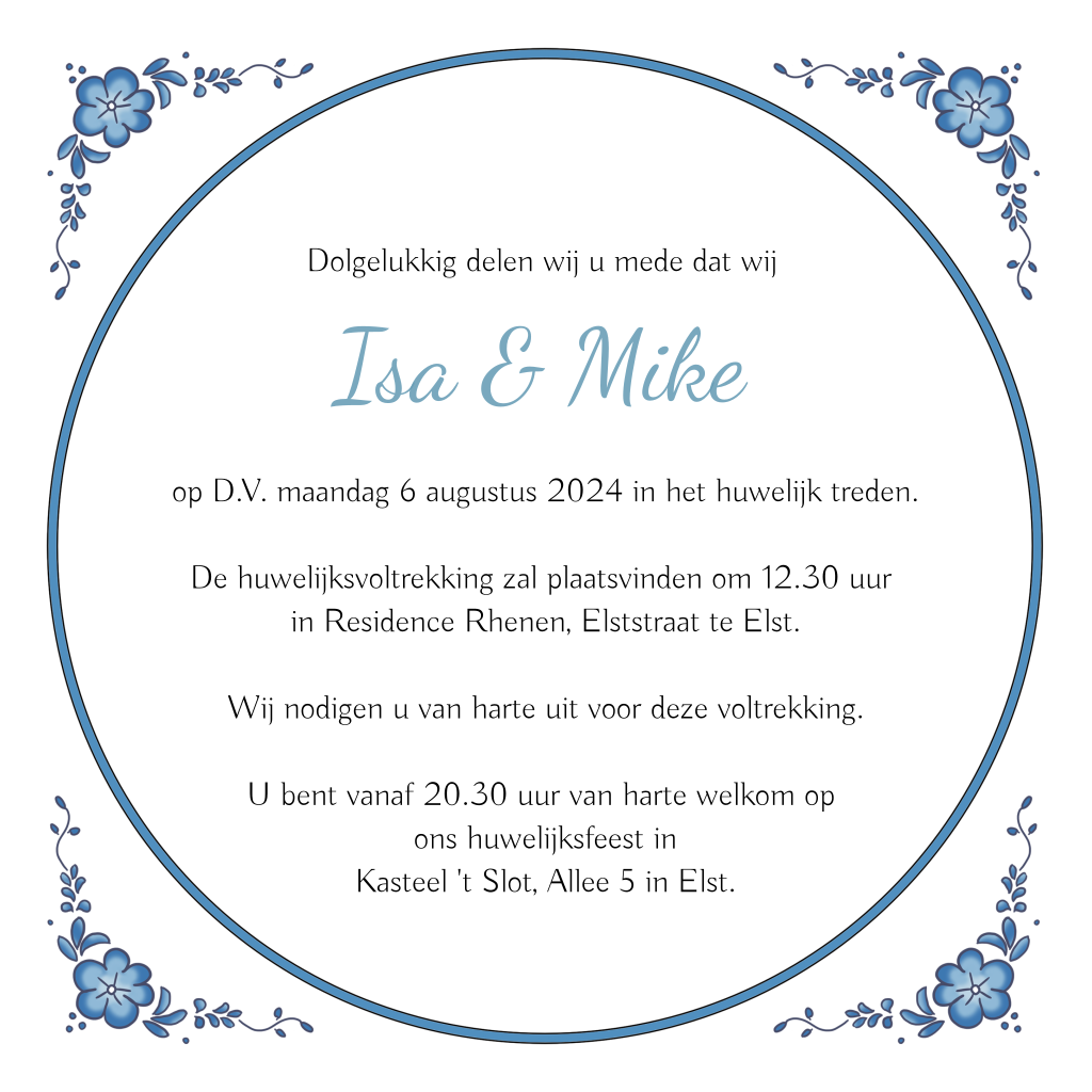 Delftsblauwe trouwkaart met molen en fietsers. (20958)