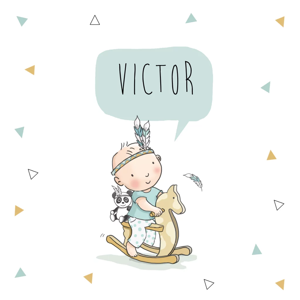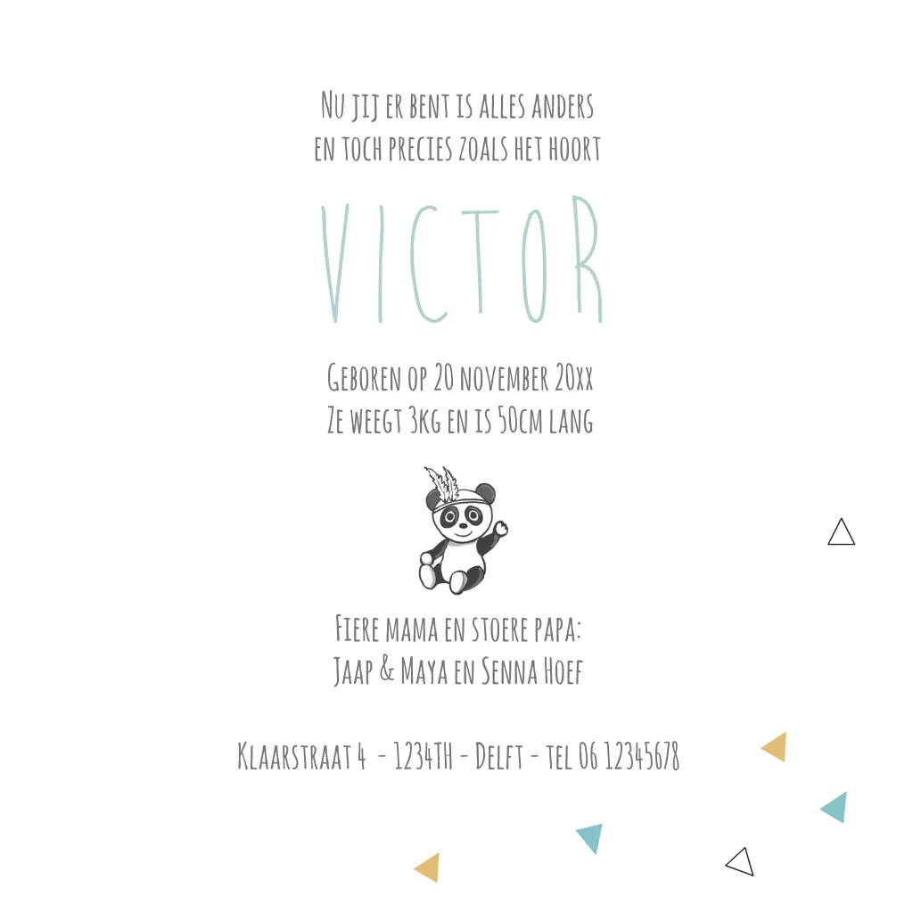 Mooi getekend geboortekaartje van een jongen indiaan op paardje met pandabeer. (5643)