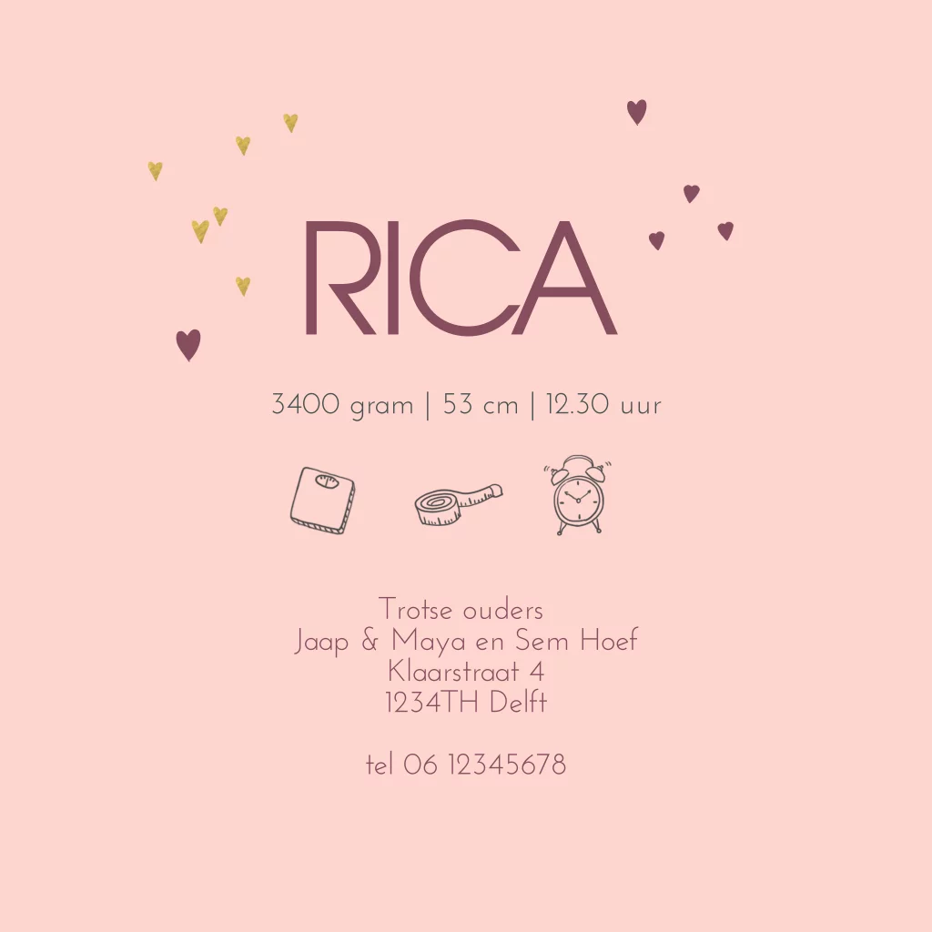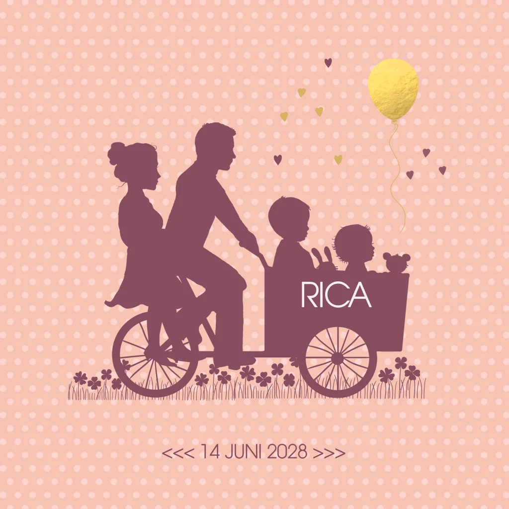 2de kindje geboortekaartje met ouders in bakfiets en baby meisje en broertje in mooie aanpasbare kleuren. Leuke goudkleurige accenten. (6756)