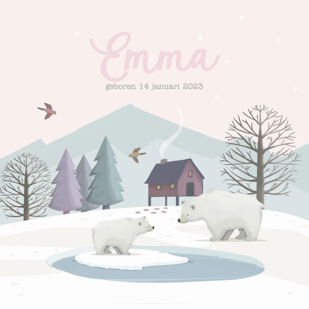 Geboortekaartje voor een meisje met ijsbeertjes in een leuk winters tafereeltje 20456)