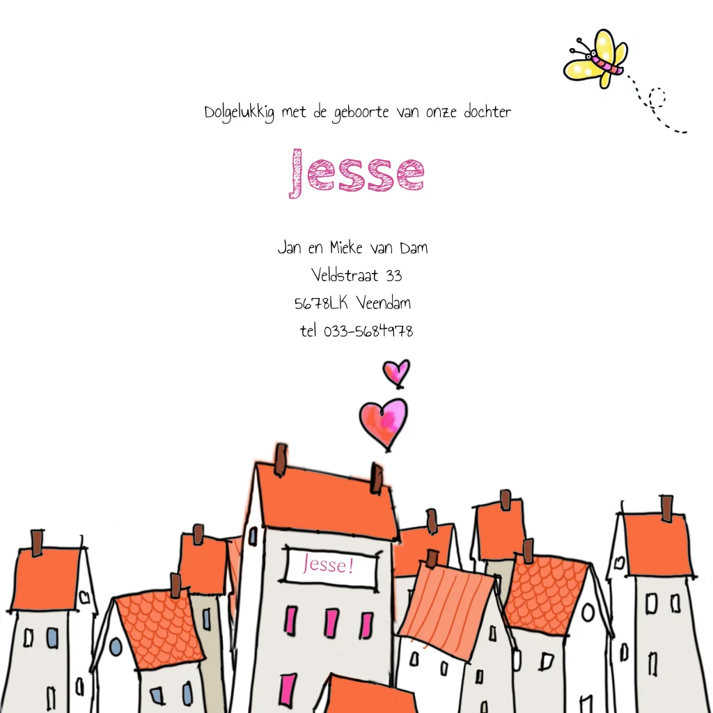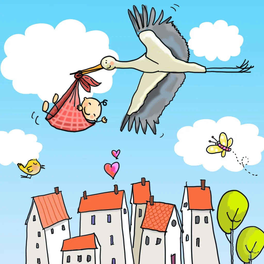 Geboortekaart meisje ooievaar door lucht over huizen. (1591)