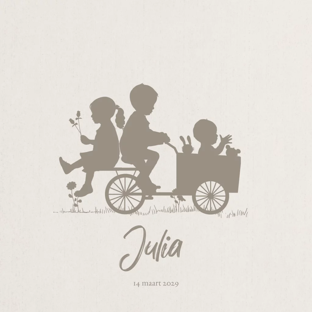 Geboortekaartje 3e kindje meisje in bakfiets samen met broer en zus