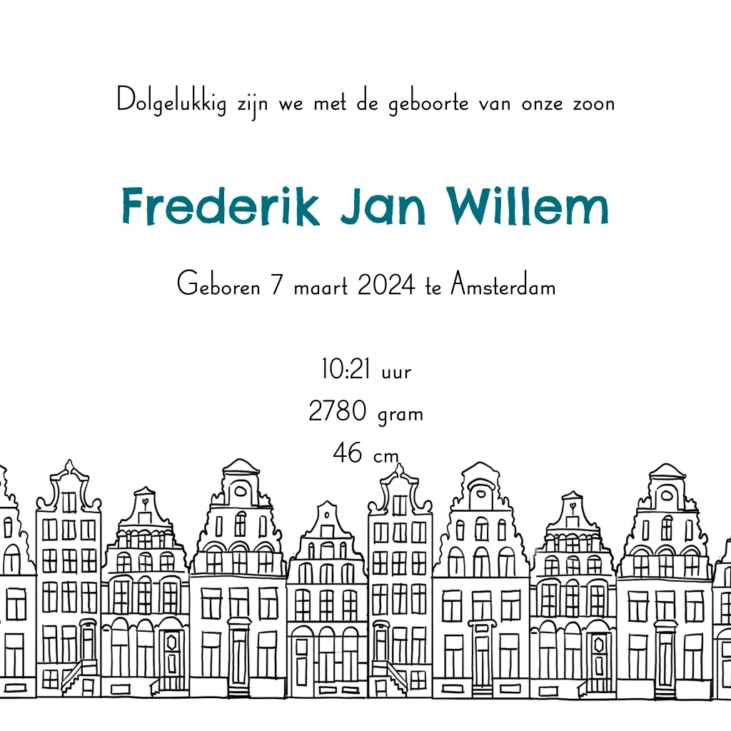 Modern Amsterdams geboortekaartje met grachtenpanden grachten huisjes. Verander eenvoudig zelf de kleur van de huisjes. (1947)