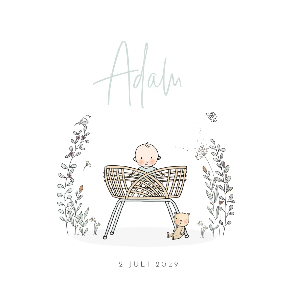 Geboortekaartje baby jongen in rotan wiegje met takjes. (21114)