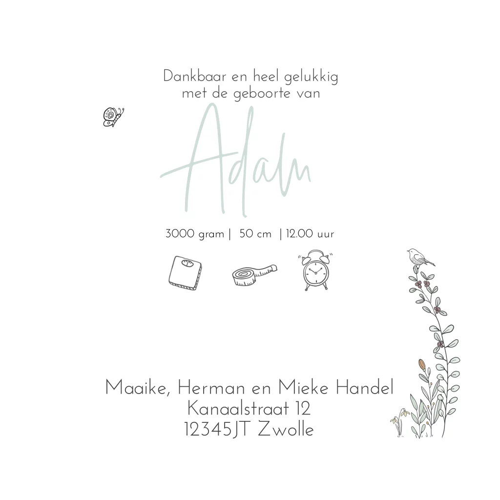 Geboortekaartje baby jongen in rotan wiegje met takjes