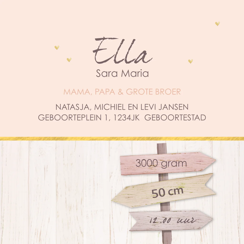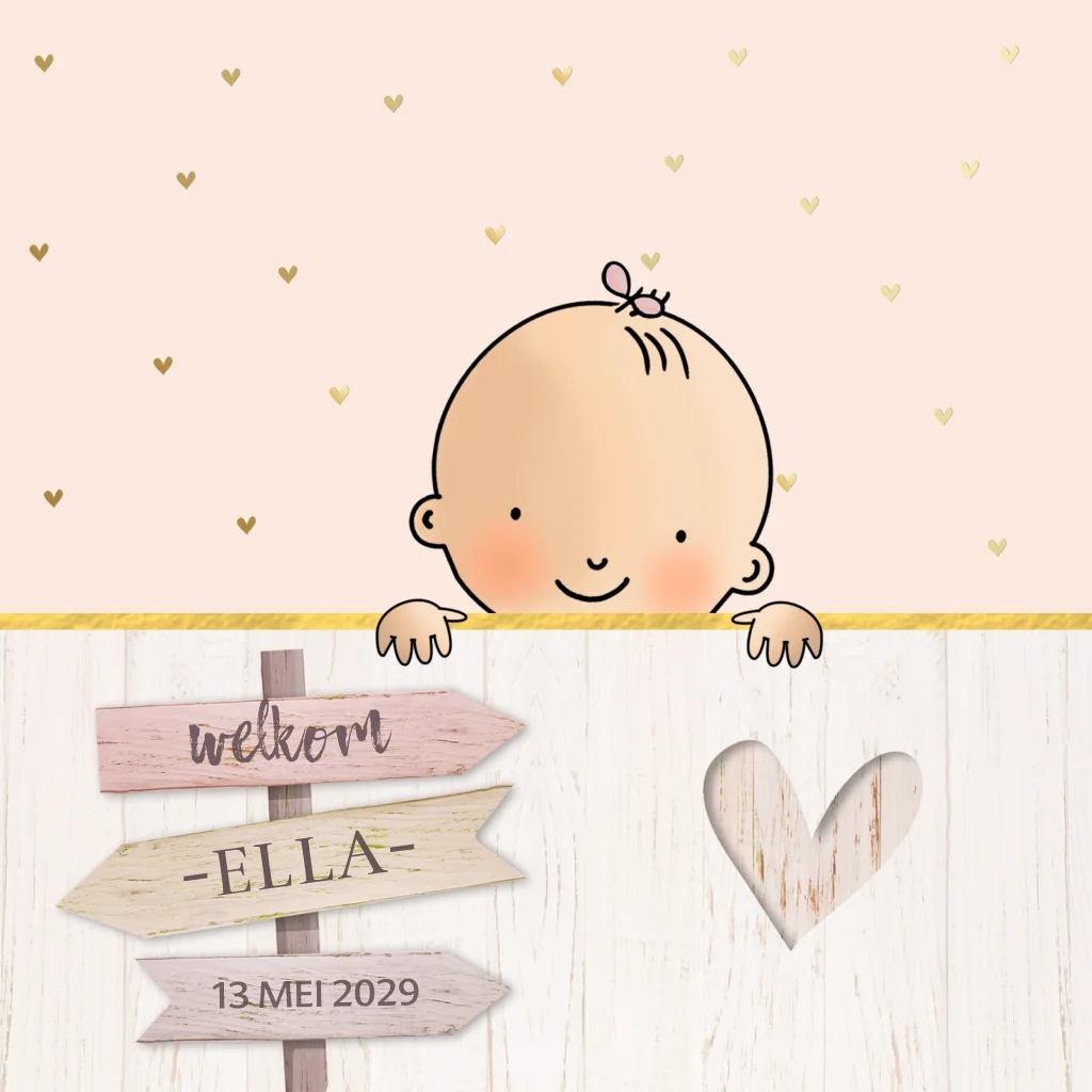 Geboortekaartje baby meisje met goud hartjes, meisje is geïllustreerd en ook broers zussen zijn erbij te plaatsen. (8571)