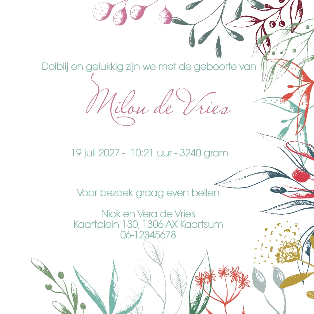 Geboortekaartje bohemian en floral stijl met takjes in verschillende KLEURRIJKE kleuren. (7627) Geboortekaartje floral stijl