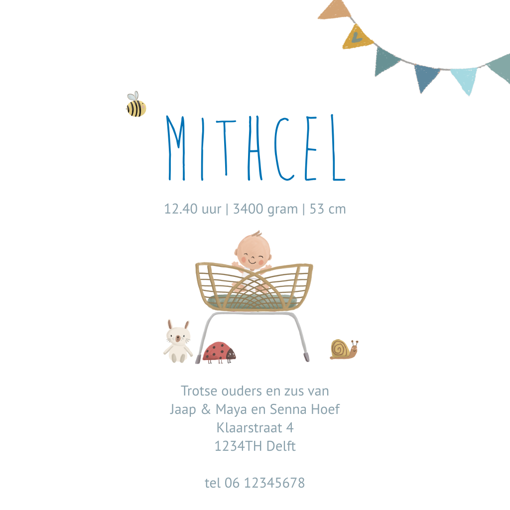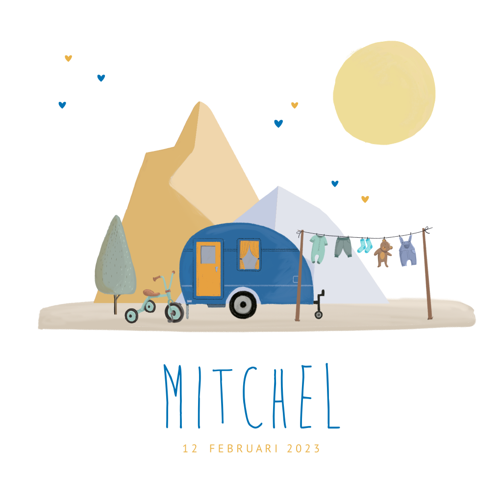 Geboortekaartje jongen kamperen bergen met caravan en waslijn