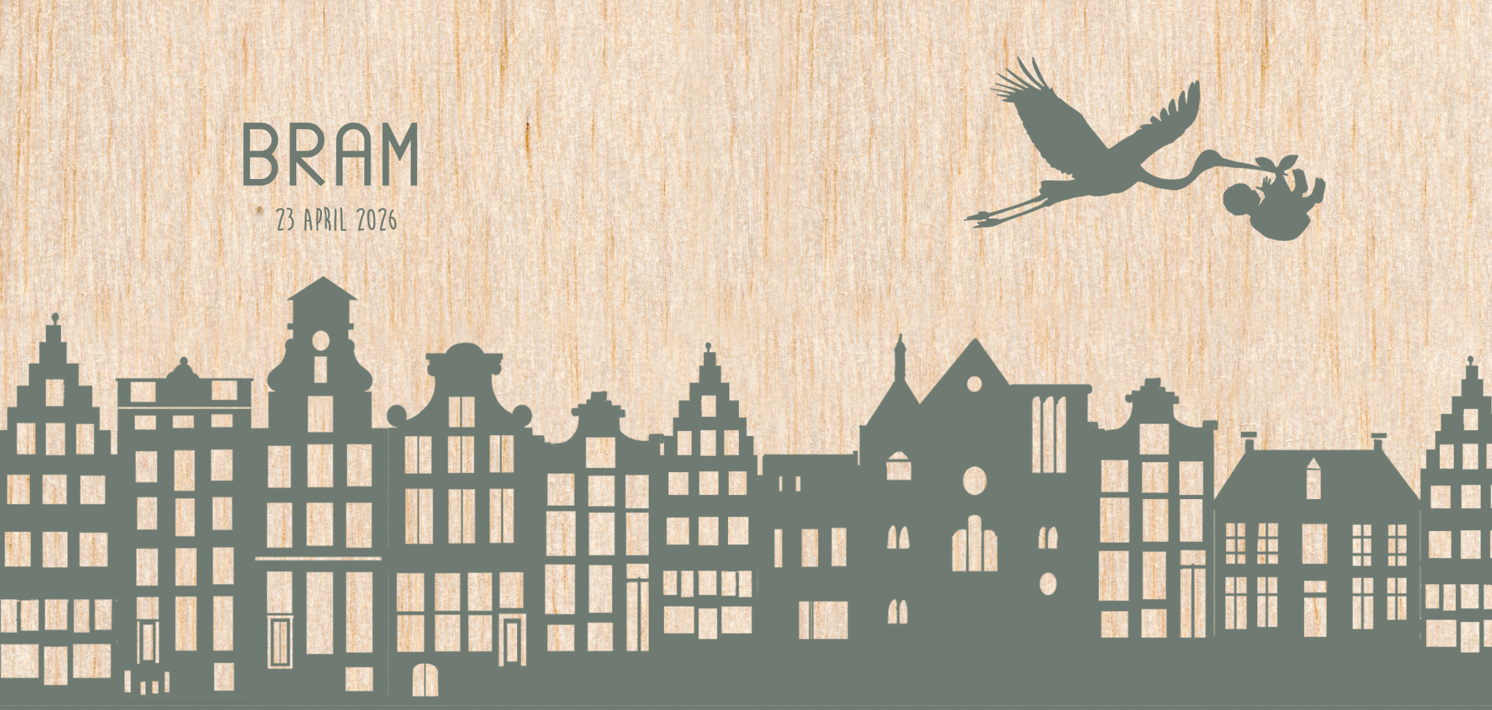 Geboortekaartje jongen met huisjes en ooievaar op echt hout
