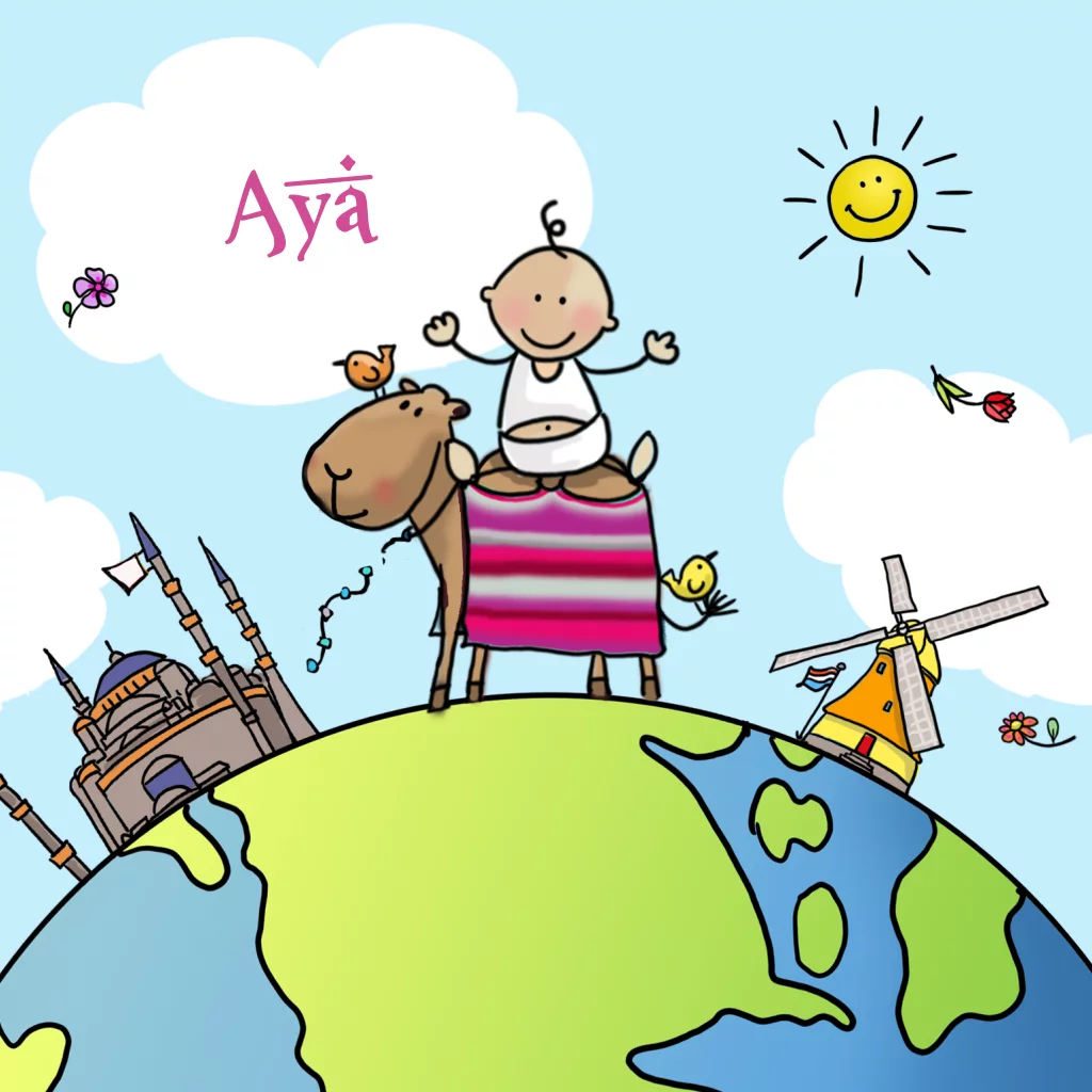 Geboortekaartje meisje arabisch islamitisch op wereldbol meisje op een lieve kameel, daarbij moskee, molen en diverse bloemen. (3488)