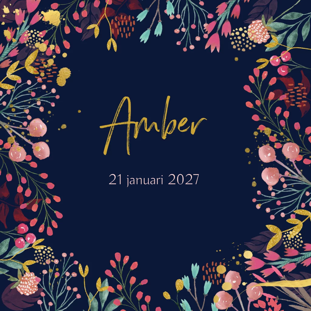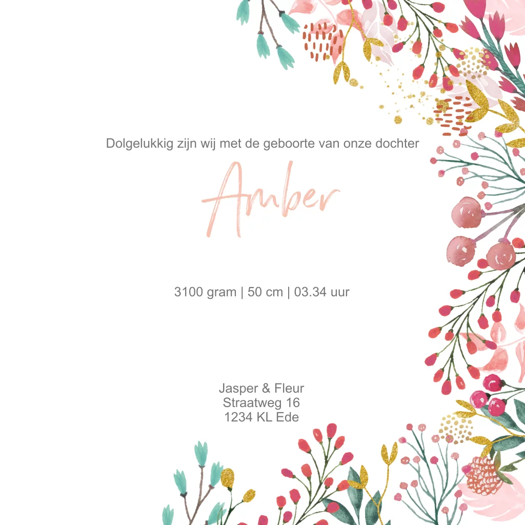 Bijzonder mooi meisjes geboortekaartje waterverf getekende bloemen in frisse kleuren op een donkere achtergrond. (8290)