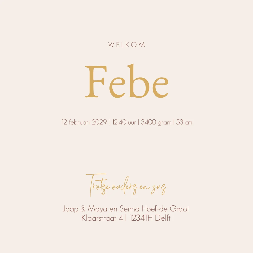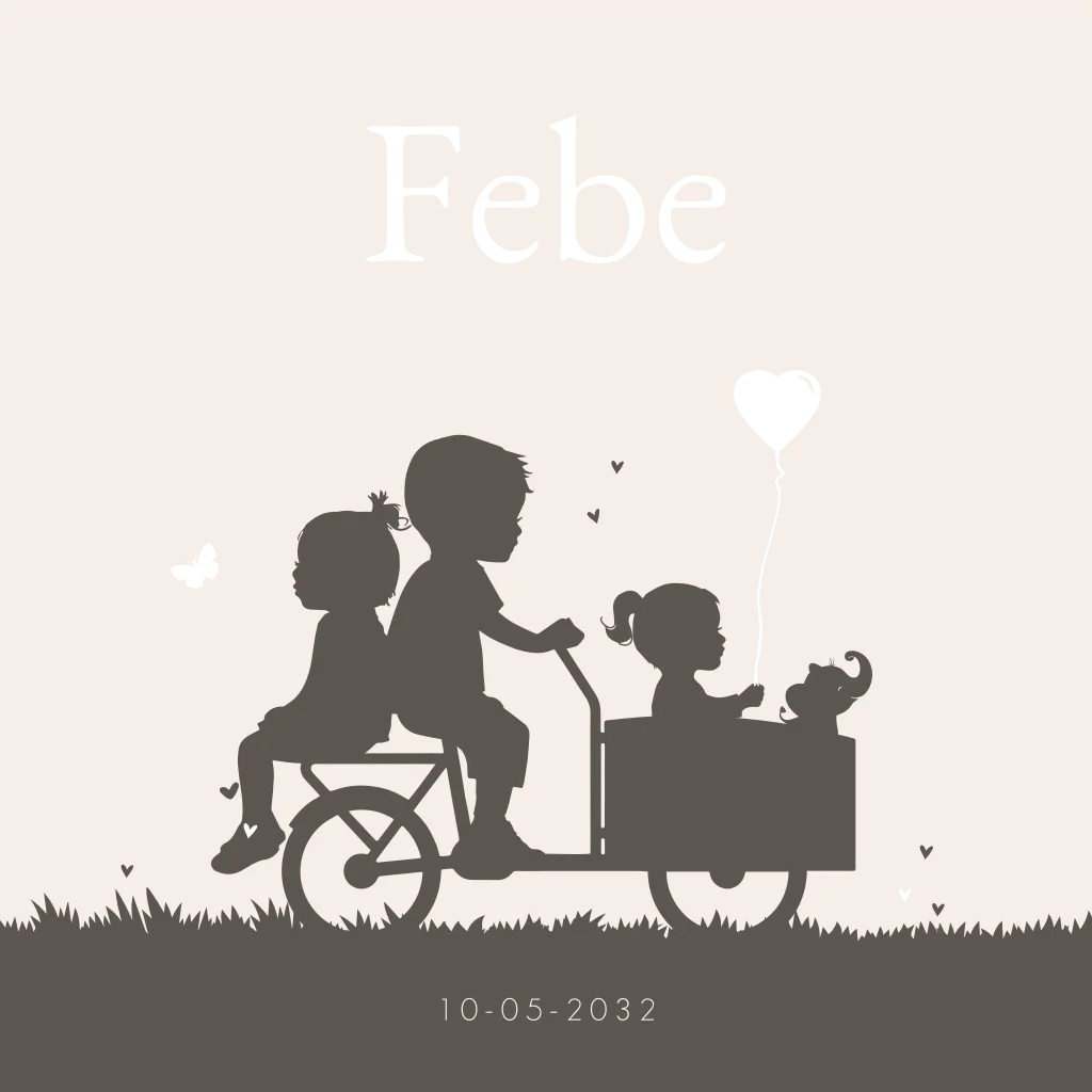 Geboortekaartje voor een derde kindje. Meisje in bakfiets met grote broer en zus. (24074) Geboortekaartje Febe.
