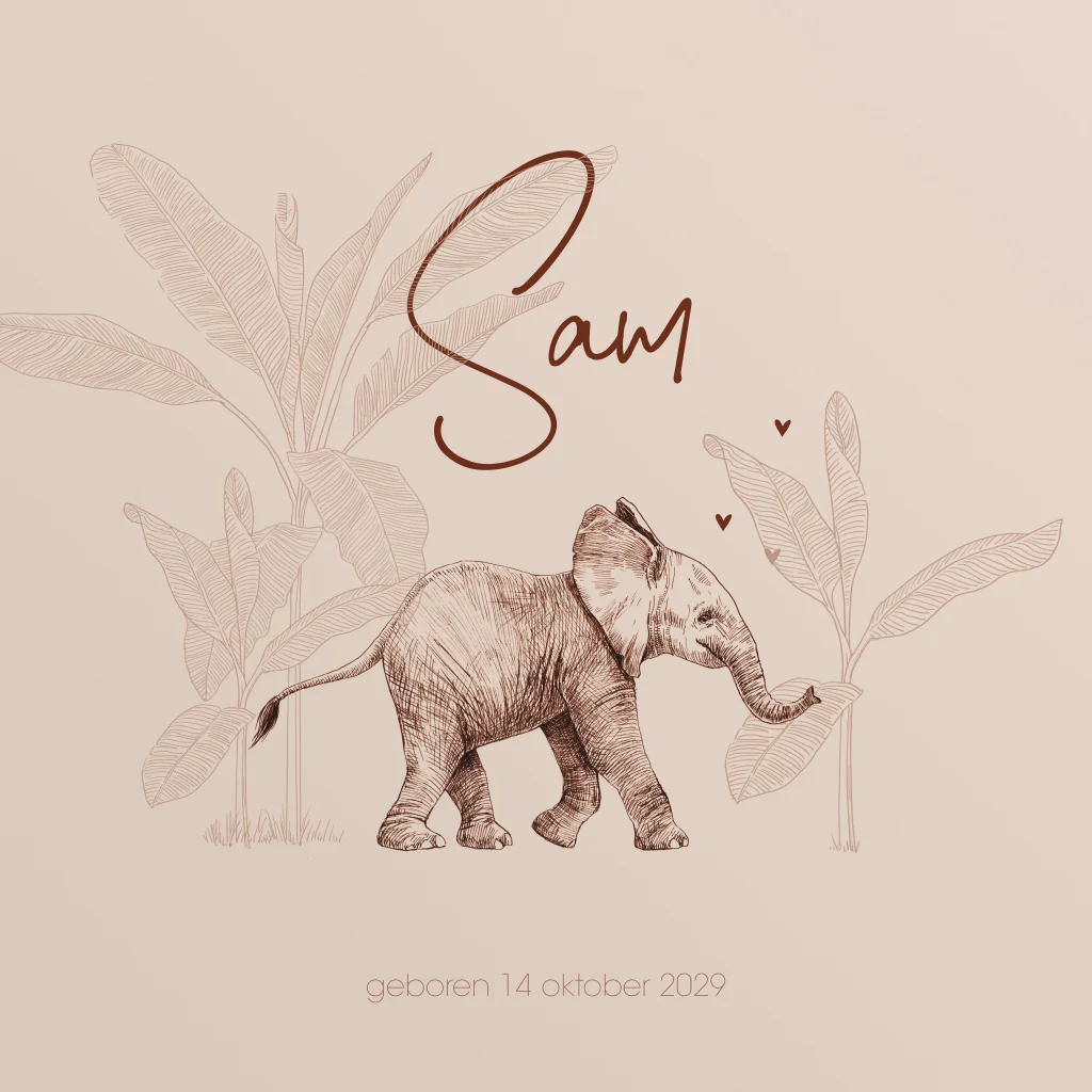 Geboortekaartje jongen klein lief olifantje met natural natuurlijke kleuren. (22395) Geboortekaartje Sam (Dit kaartje heeft nu ronde hoeken a € 0,30 per kaartje)