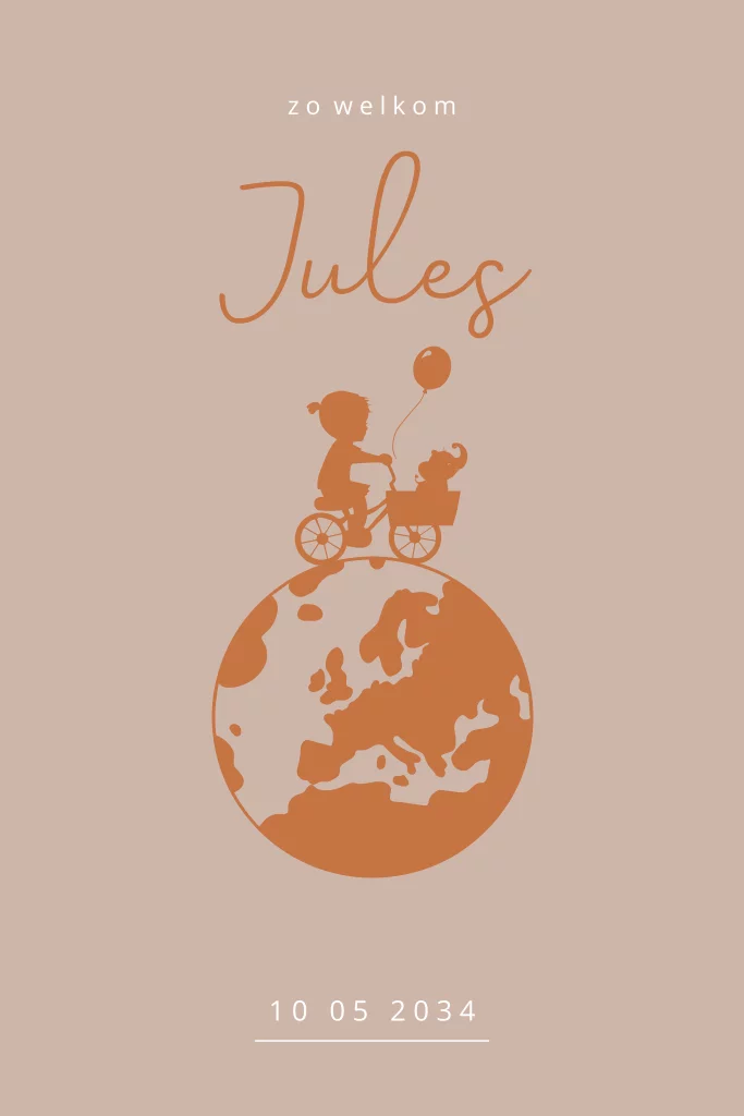 Geboortekaartje meisje wereldbol met fietsje en ballon