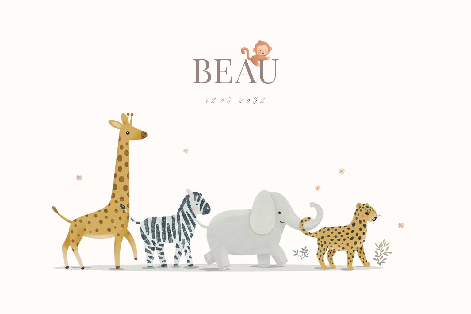 Geboortekaartje met optocht dieren giraf zebra olifant tijger