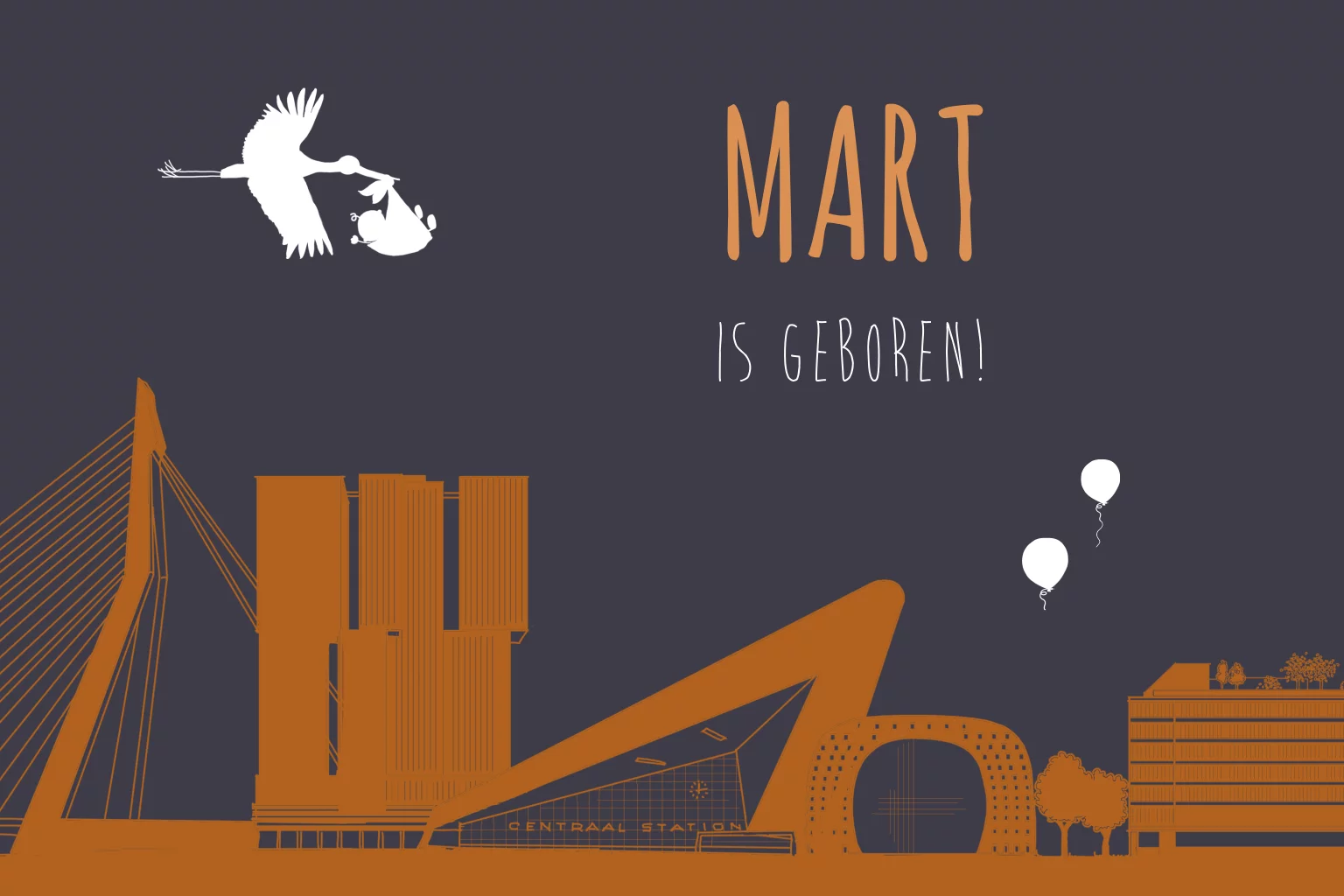Geboortekaartje Rotterdamse gebouwen op donkerblauwe achtergrond. Kleuren naar keuze aan te passen. Met oa de rotterdam, markthal, erasmusbrug en het centraal station. (7393)