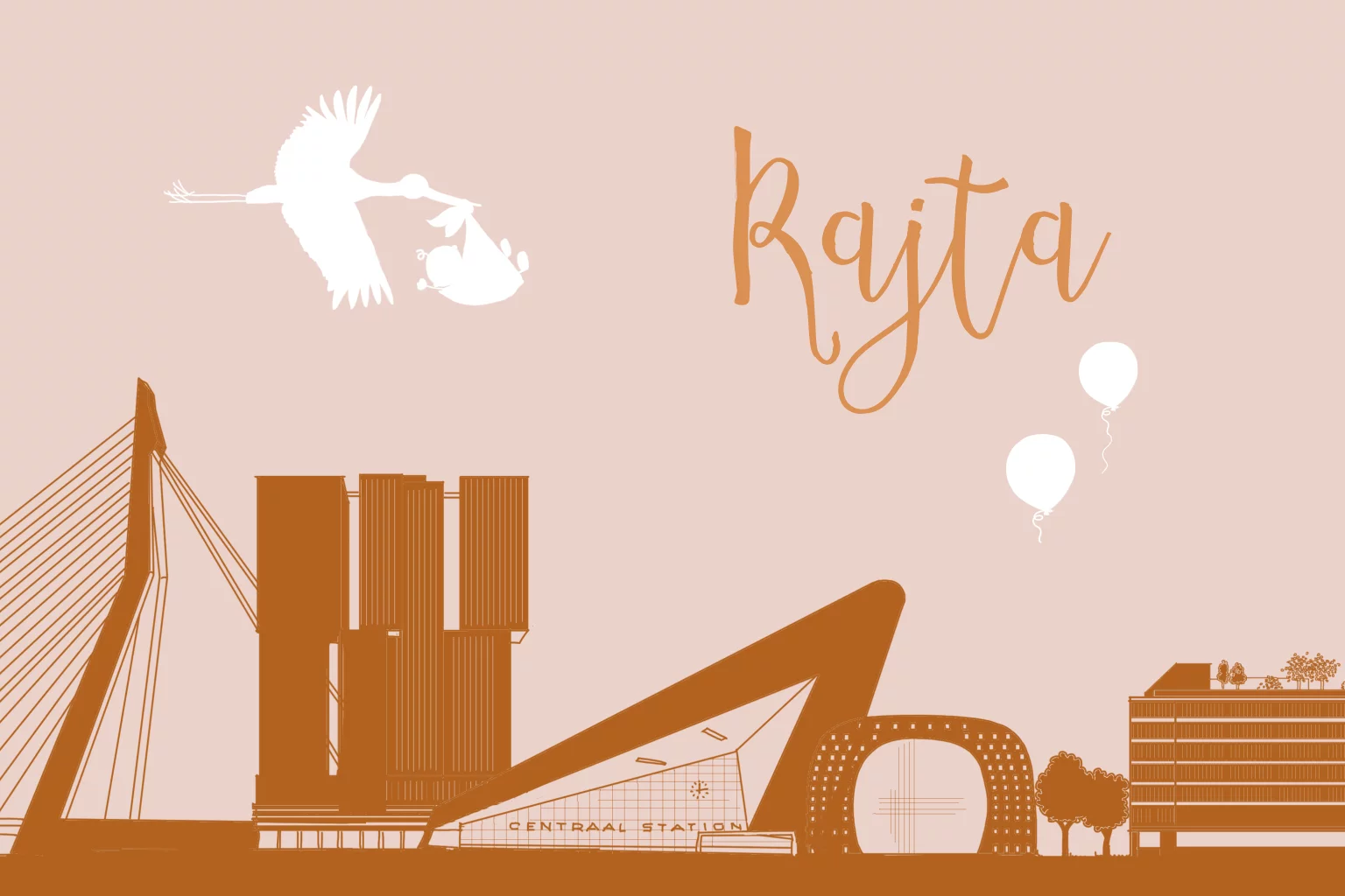 Geboortekaartje Rotterdamse gebouwen op roze achtergrond. Kleuren naar keuze aan te passen. Met oa de rotterdam, markthal, erasmusbrug en het centraal station. (7394)