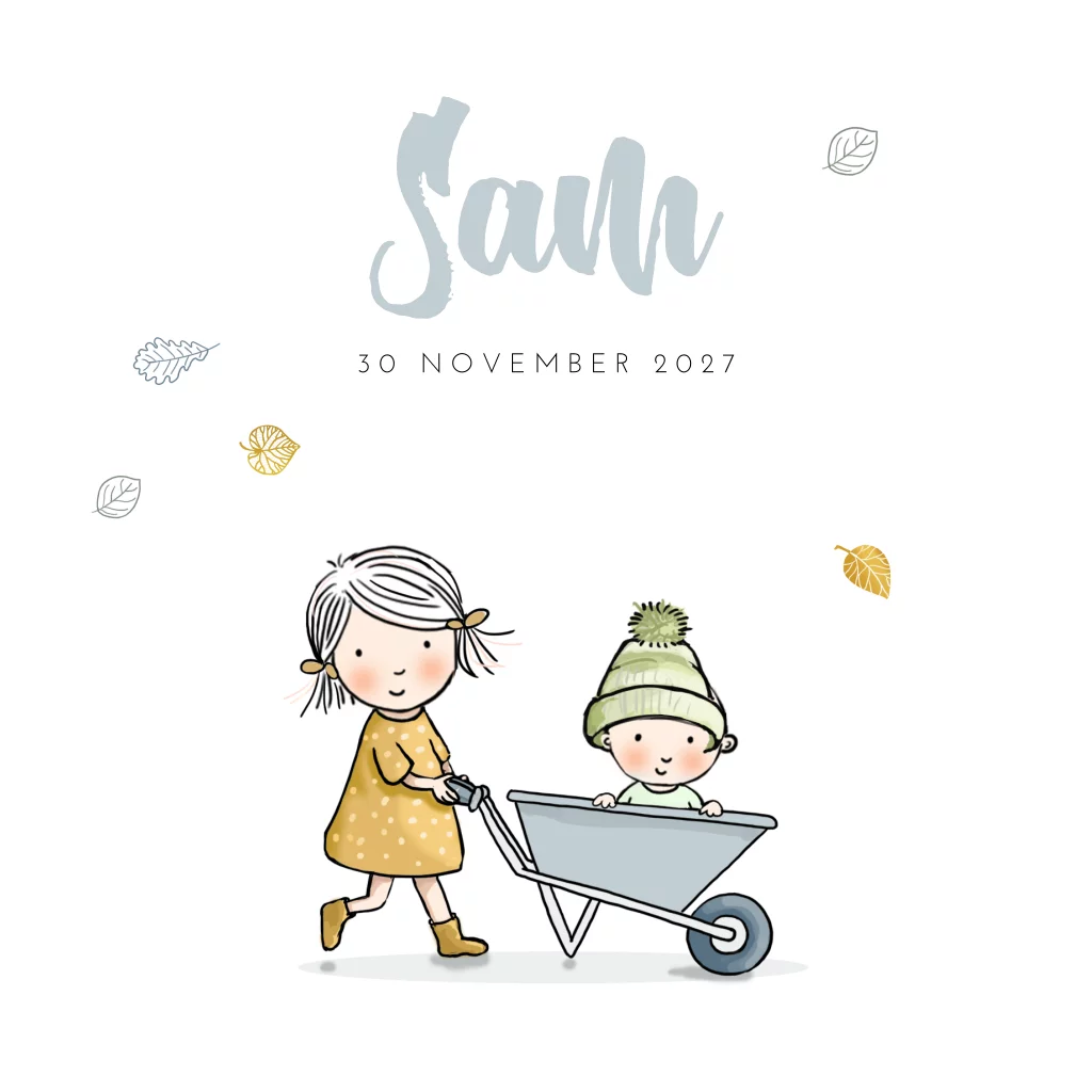 Geboortekaartje 2e kindje meisje met de baby in een kruiwagen met grote zus. (7548) Geboortekaart Sam