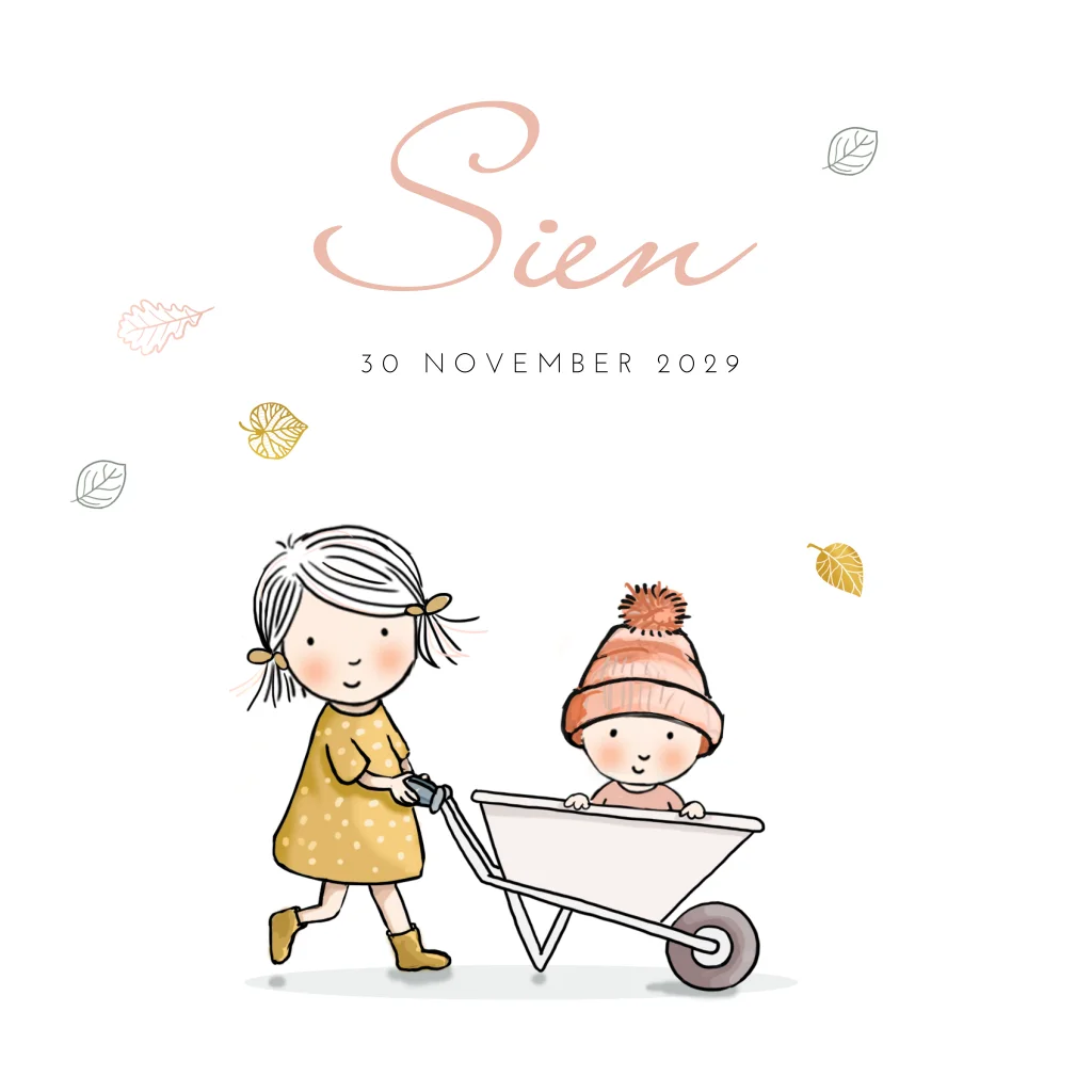 2e kindje geboortekaartje meisje met grote zus met kruiwagen en baby meisje. (7549)