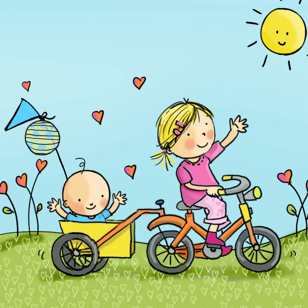 Getekend geboortekaartje met zus en klein broertje