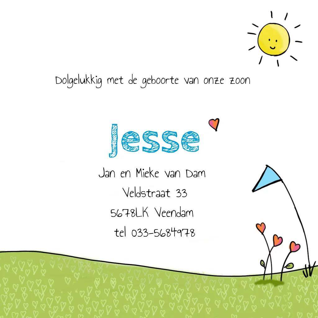 2e kindje geboortekaartje met zus en klein broertje. Over groen grasveld en blauwe lucht. (403)