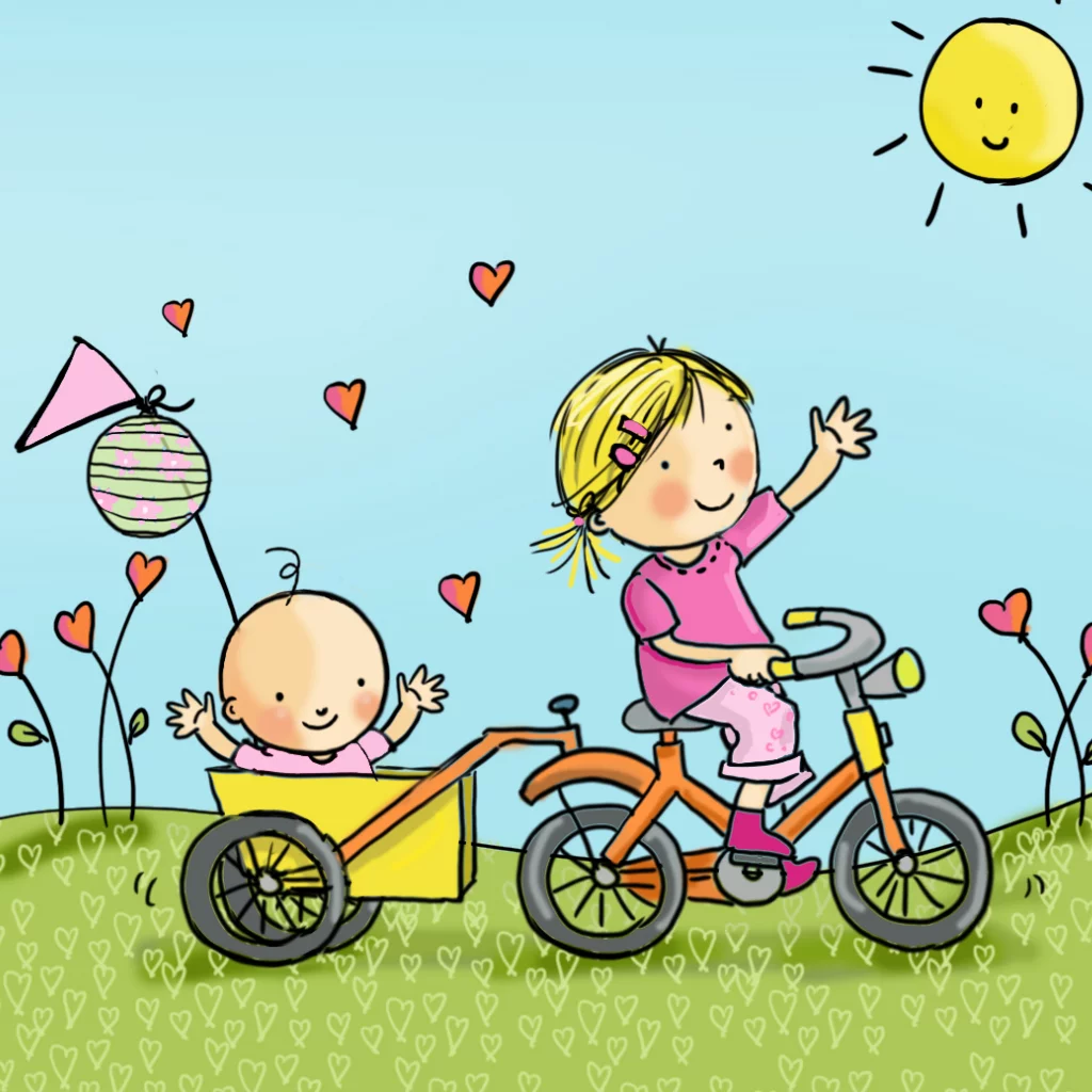 Geillustreerde geboortekaart grote zus op fiets met 2e kindje meisje