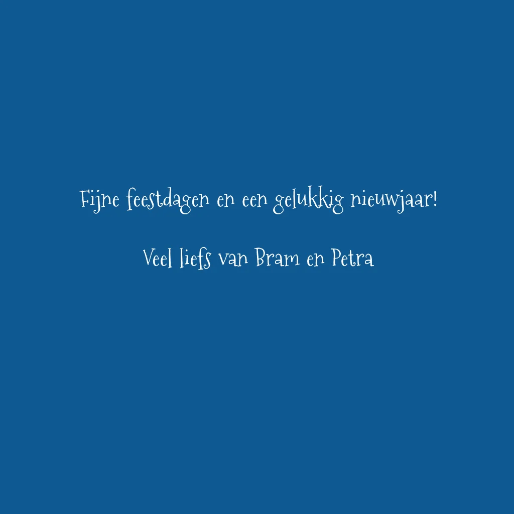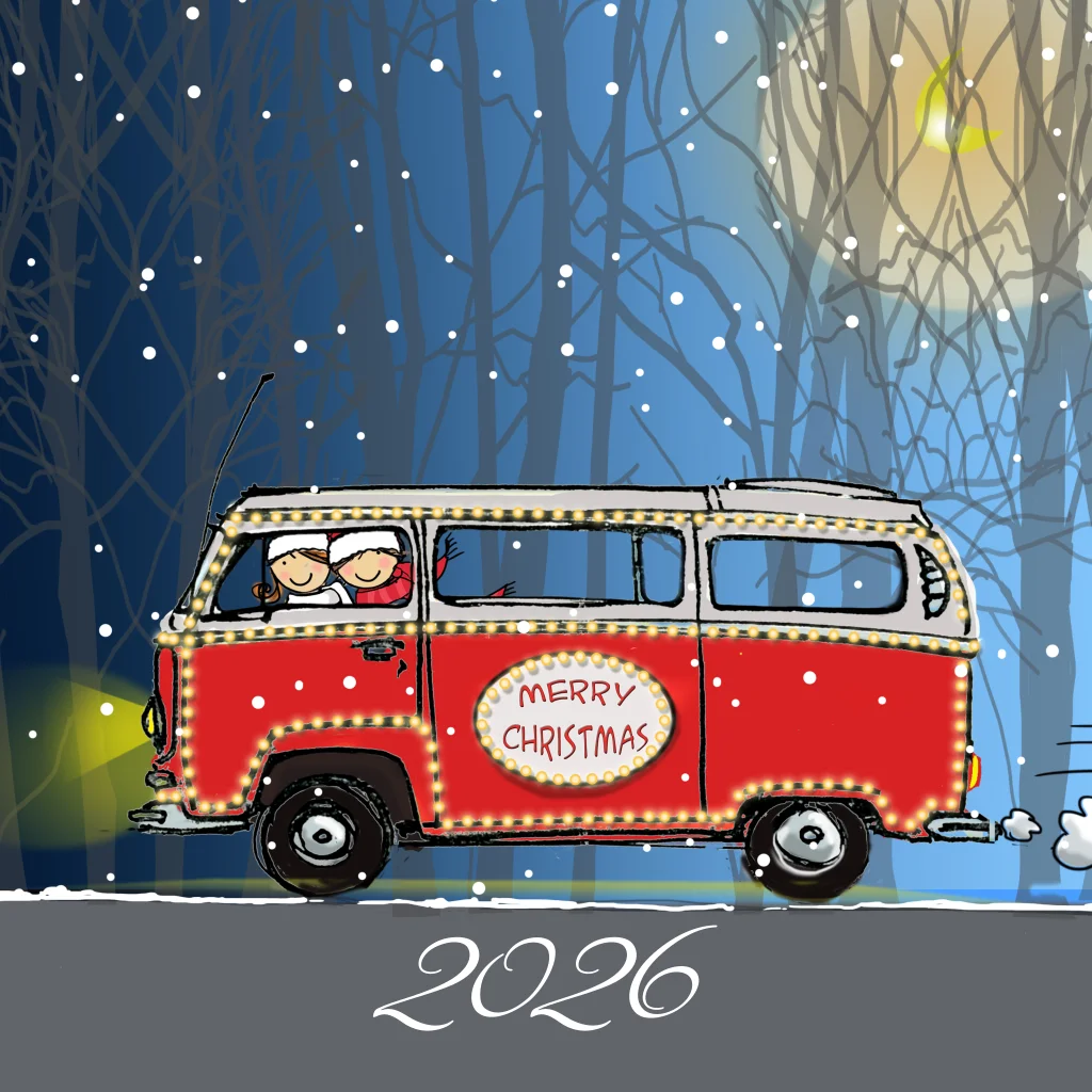 Geïllustreerde kerst kaart met volkswagen bus en stelletje. Avond maan licht en bomen op de achtergrond. (1242)