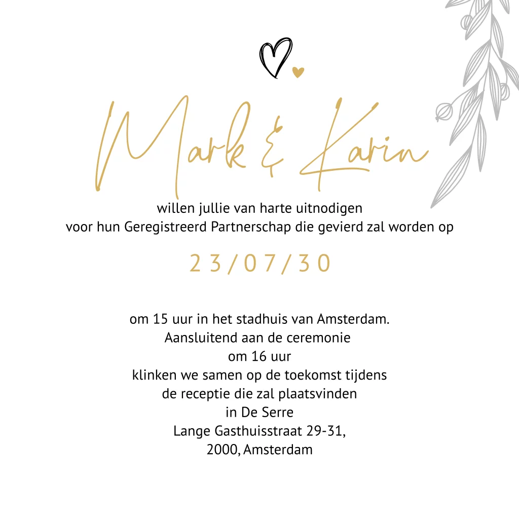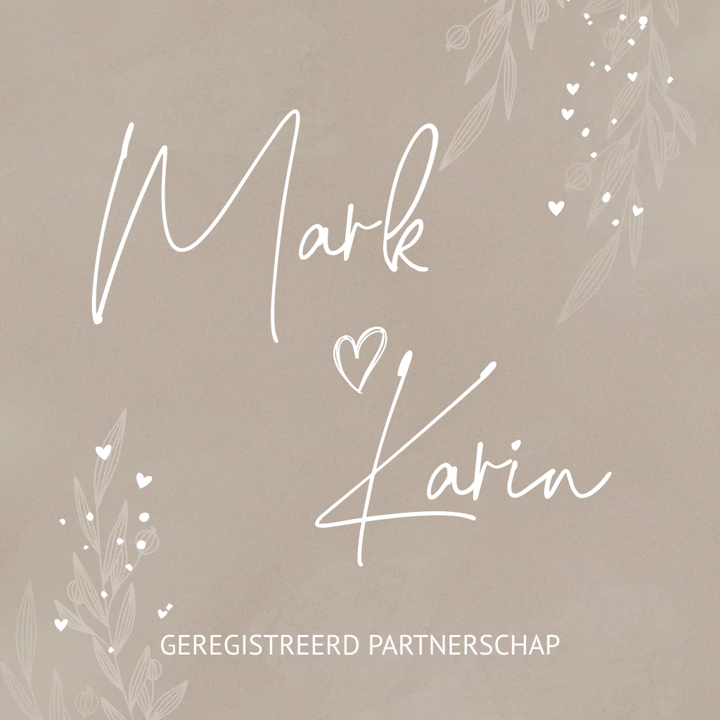 Geregistreerd partnerschap uitnodiging kaart zandtint met goudfolie takjes en hartjes. (22952)
