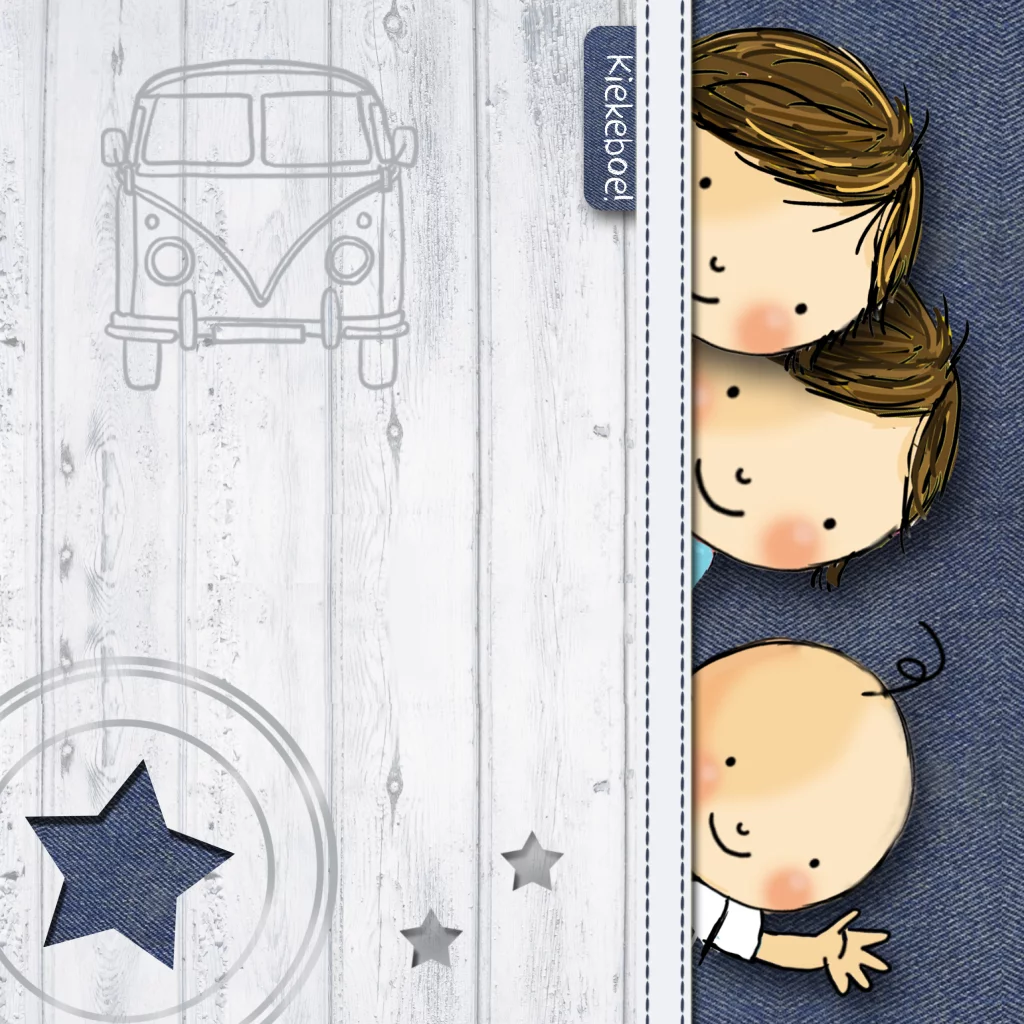 Getekend geboortekaartje derde kindje met hout. Blauw spijkerstof en blauwe ster met oldtimer.