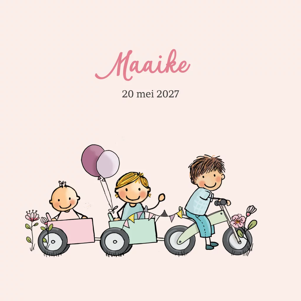 Derde kindje geboortekaartje broers en zusje met loopfiets