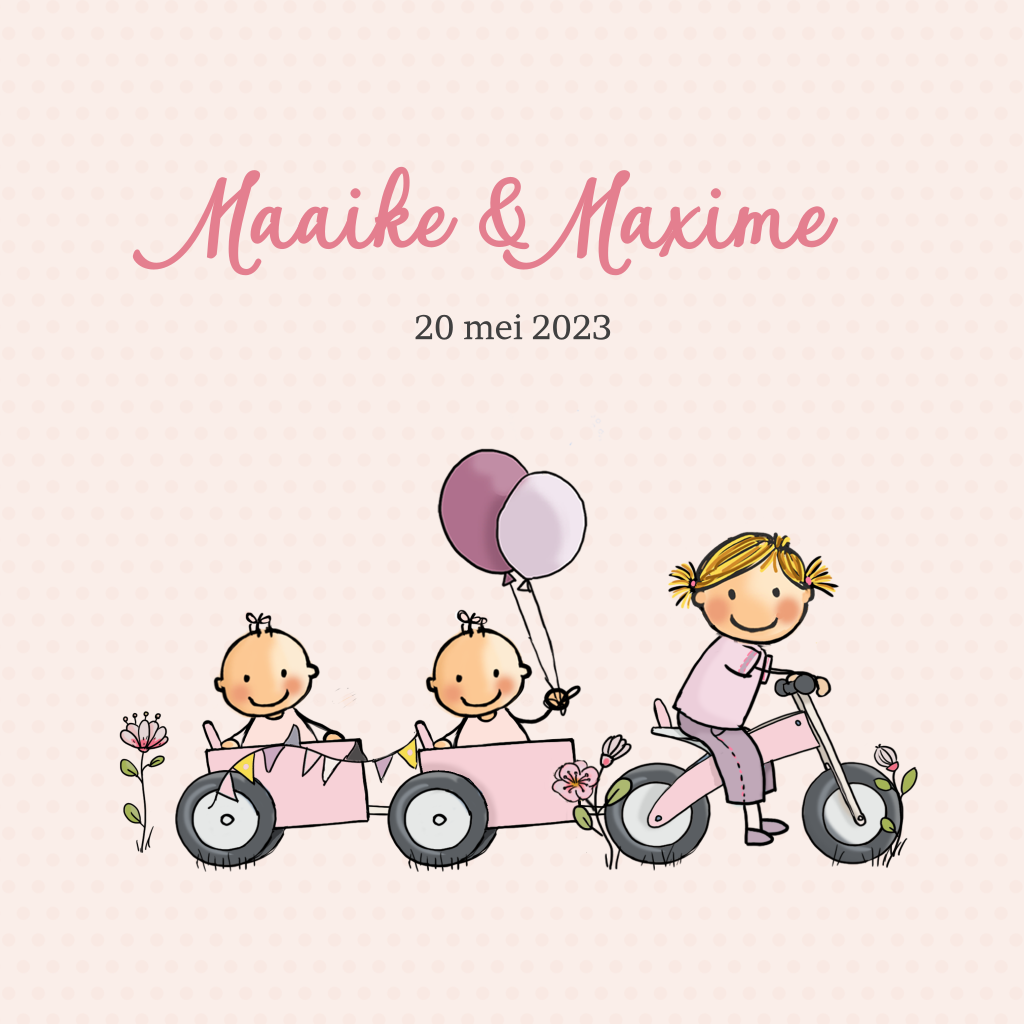 Getekend geboortekaartje tweeling meisjes met loopfiets