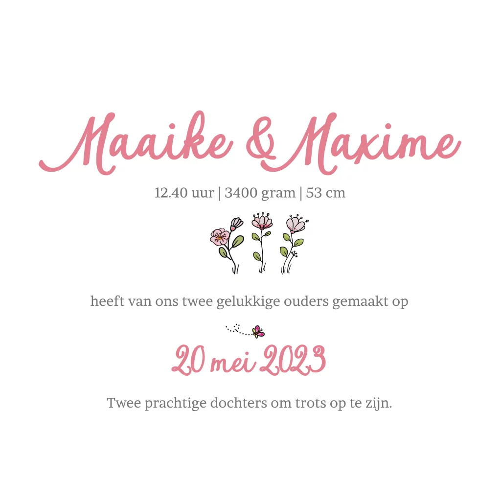 Getekend geboortekaartje tweeling meisjes met loopfiets