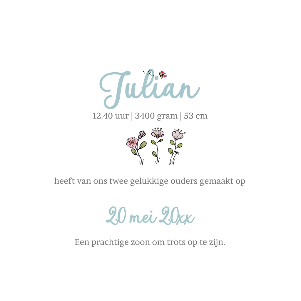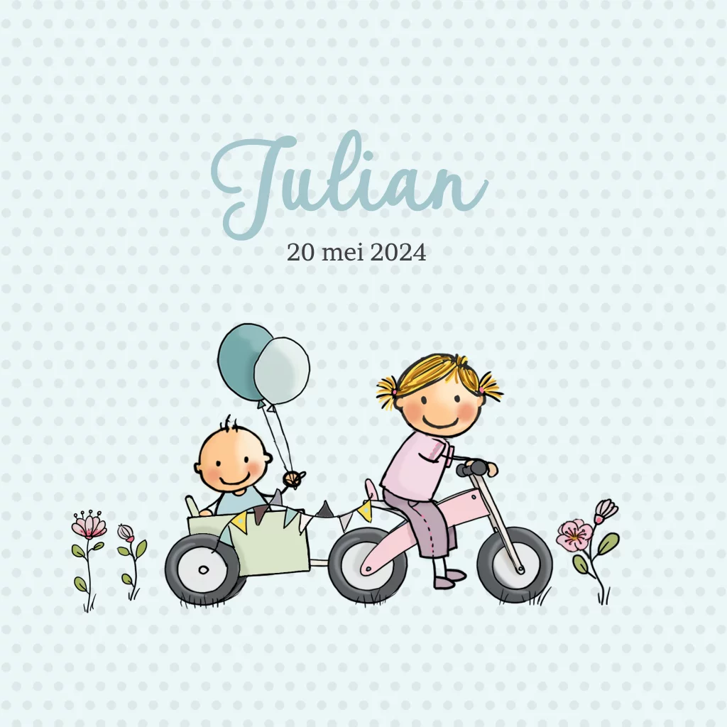 2de kindje geboortekaartje in voorjaar kleuren, grote zus met baby broertje met loopfietsje. (6675)