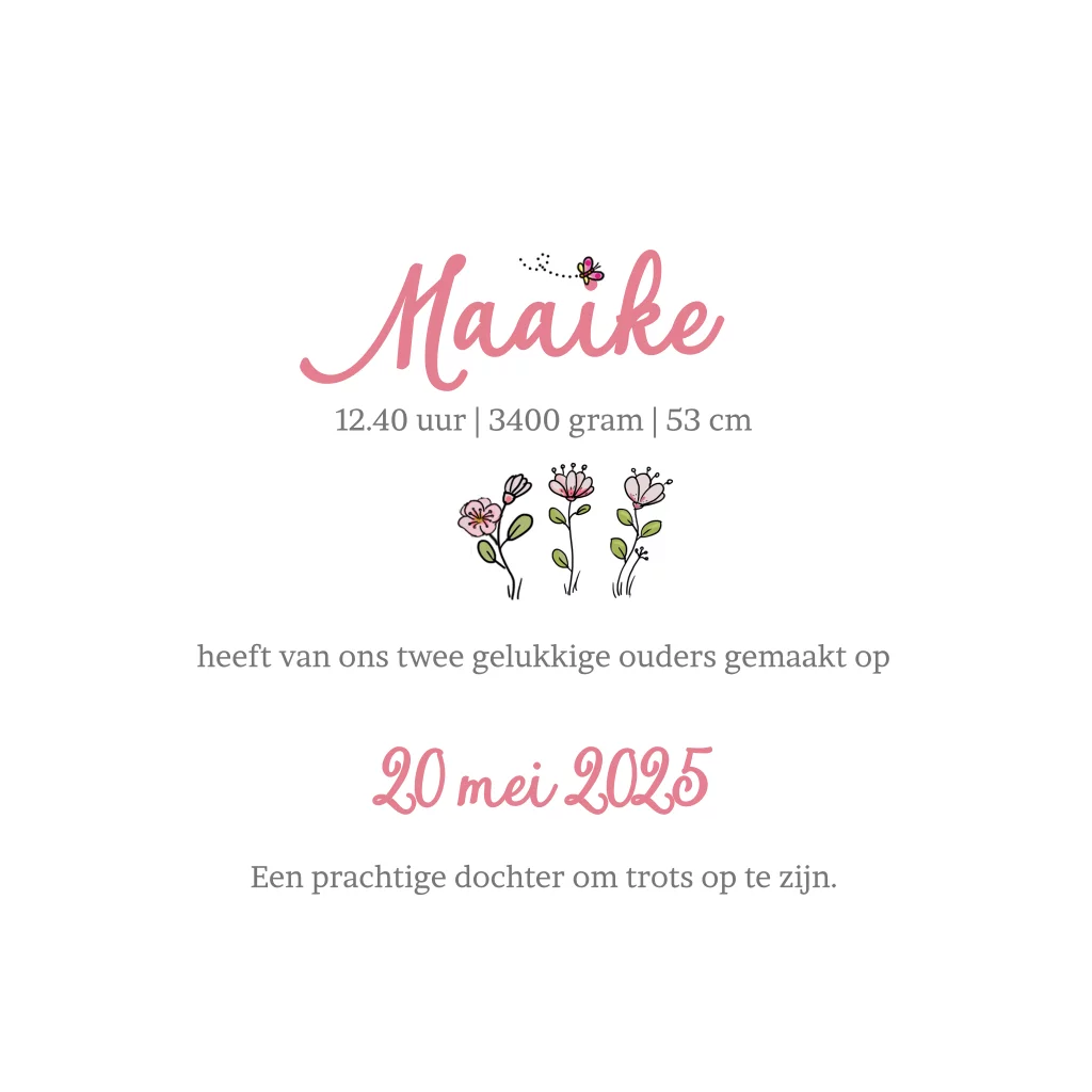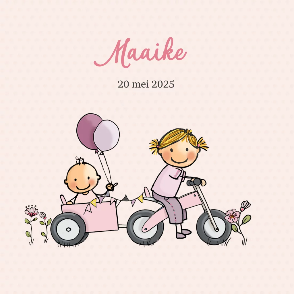 Getekend geboortekaartje in frisse roze voorjaar kleuren, twee lieve zusjes met loopfietsje voor een 2de kindje. (6664)