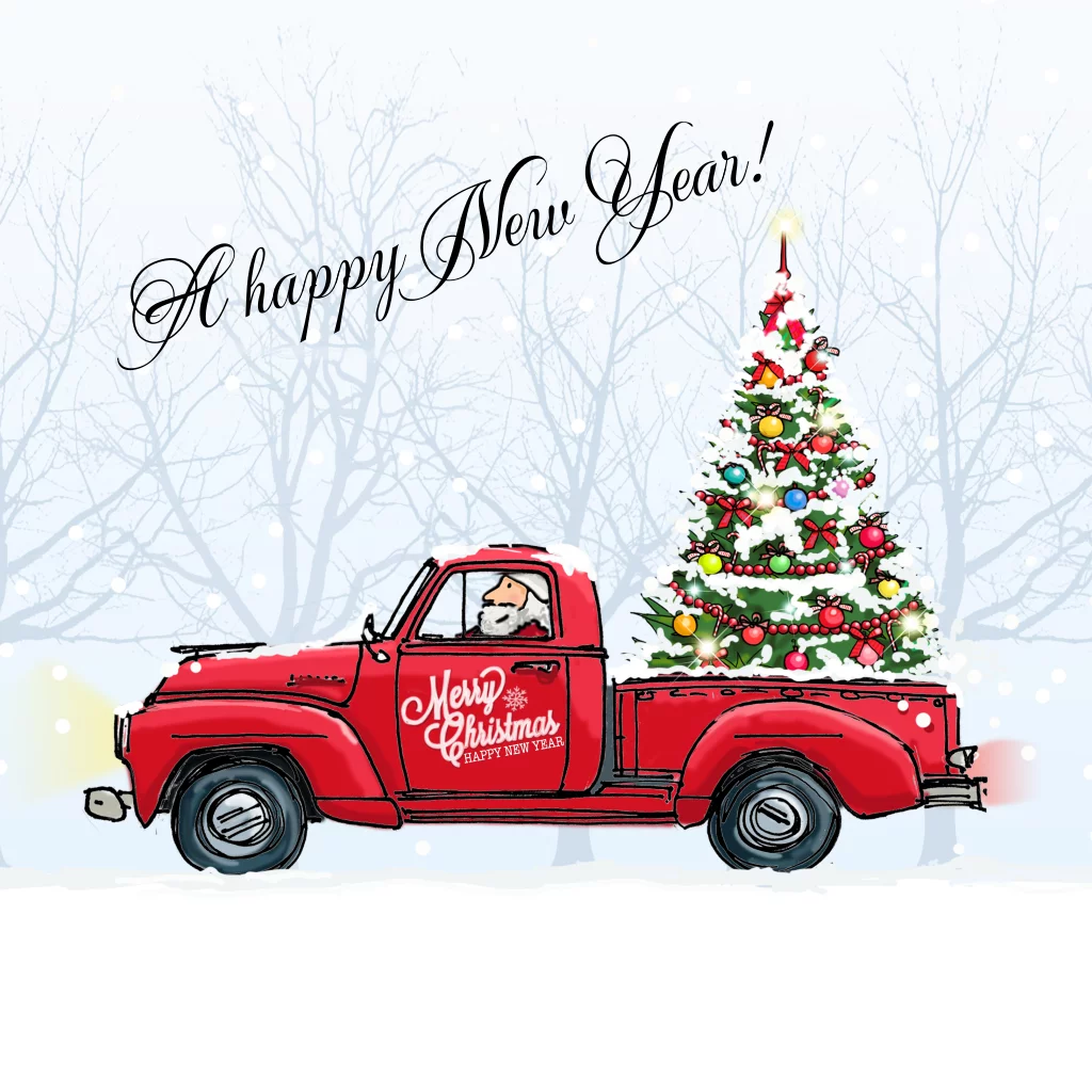 Getekende kerstkaart van amerikaanse buck pick up met kerstman