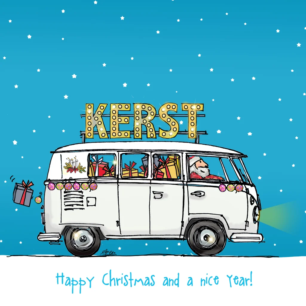 Getekende kerstkaart van hippe bus met priklampen door Anet van de Vorst. (2190)