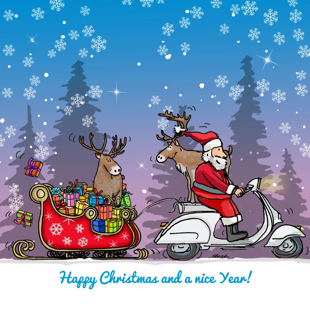 Getekende kerstkaart van vespa scooter met kerstman en arreslee