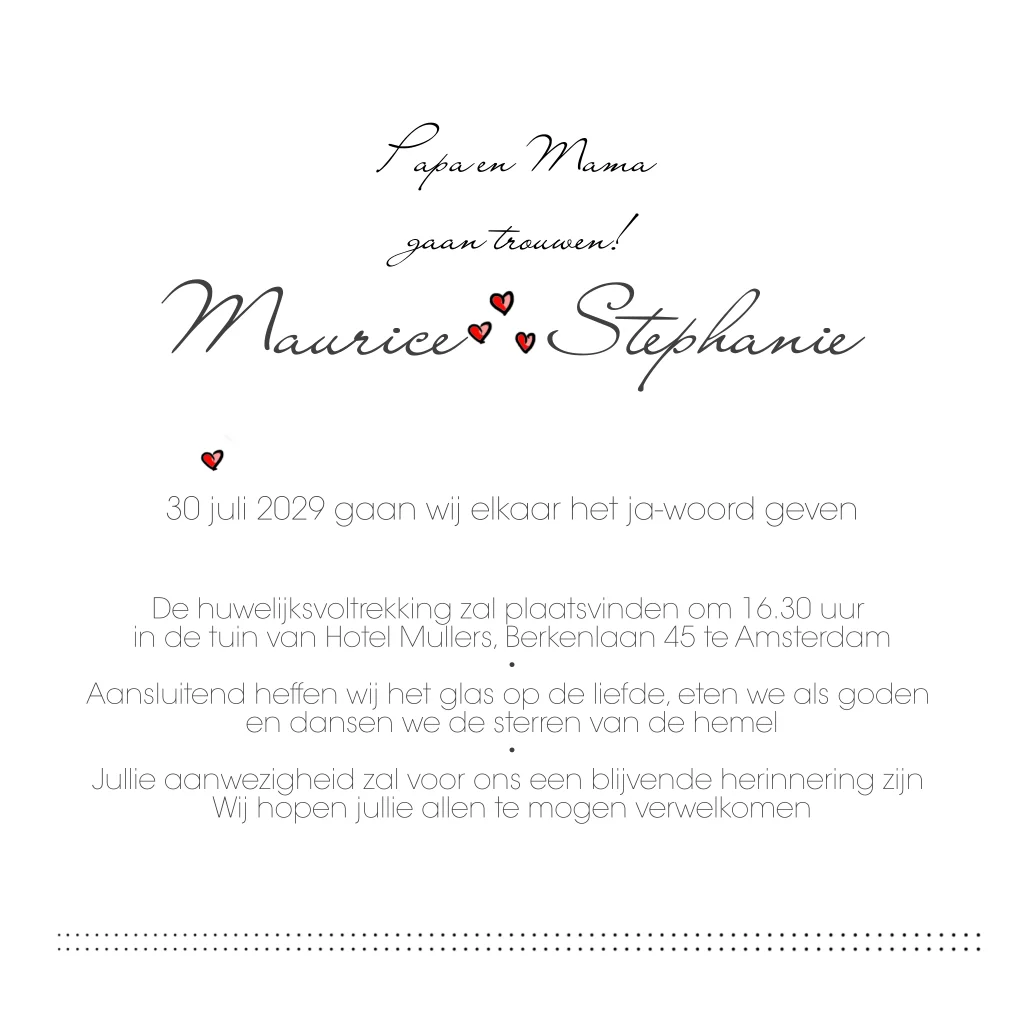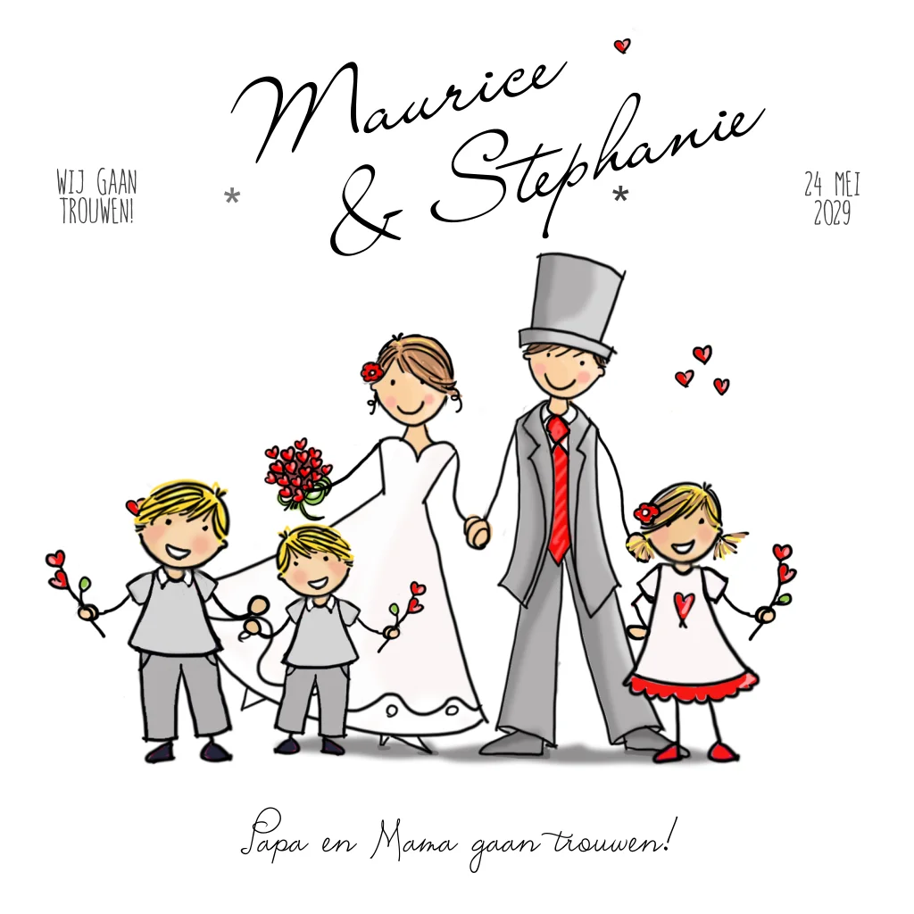Leuk getekende trouwkaart papa en mama trouwen met bruidspaar en 3 kinderen met rode hartjes en aanpasbare teksten. Kindjes zijn te verplaatsen of te verwijderen. (2811) Willen jullie de tekening aangepast hebben zodat het meer op jullie lijkt? Vaak is dat mogelijk, neem daarvoor contact met ons op.