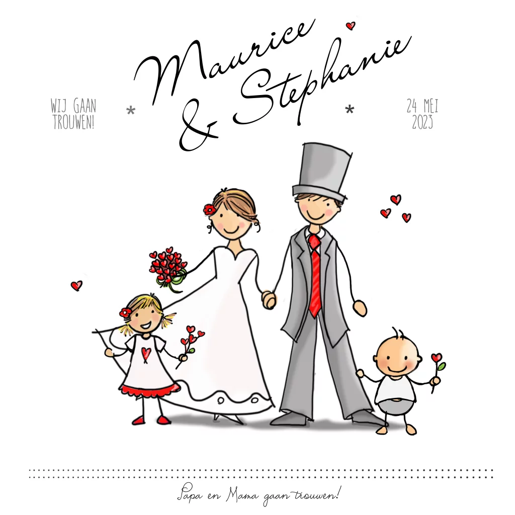 Leuk getekende trouwkaart papa en mama trouwen met bruidspaar en dochter en zoon met rode hartjes en aanpasbare teksten. Kindjes zijn te verplaatsen of te verwijderen. (2811)