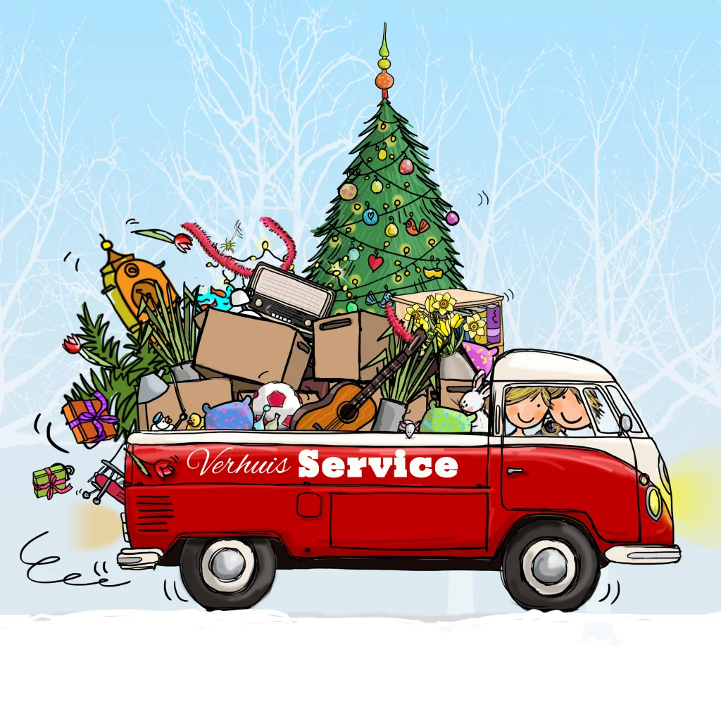 Kerst verhuiskaart maken met vwbus pick up met kerstman